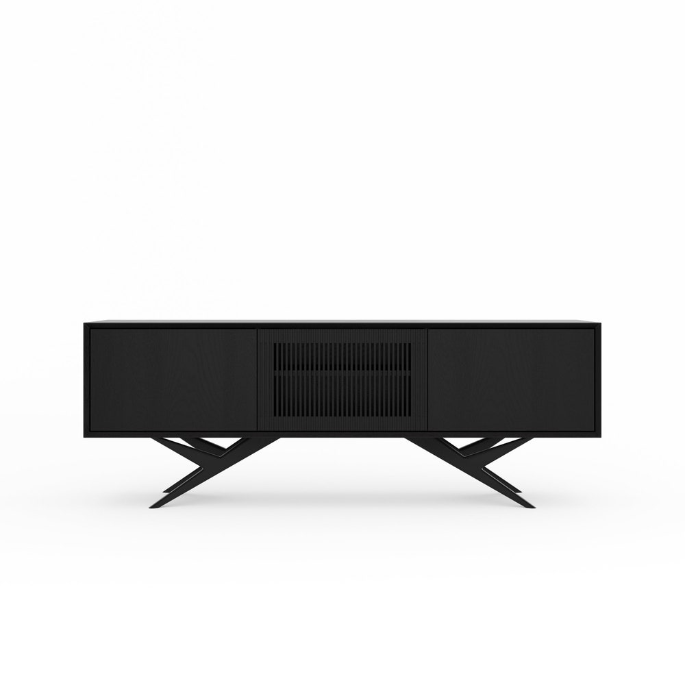 Beautiful black sideboard with three doors and organic shape base in mid century modern style.
