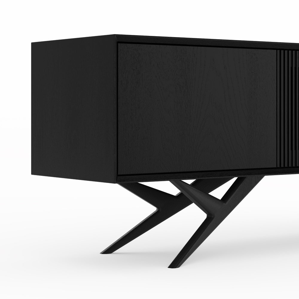 Black oak sideboard with three slatted doors and organic shape base in mid century modern style, credenza, dresser, commode, TV stand, media