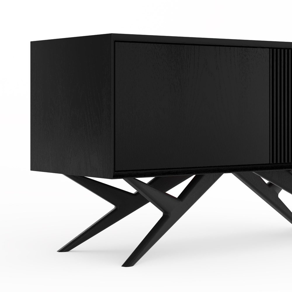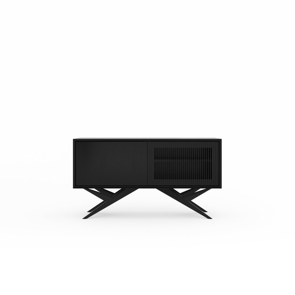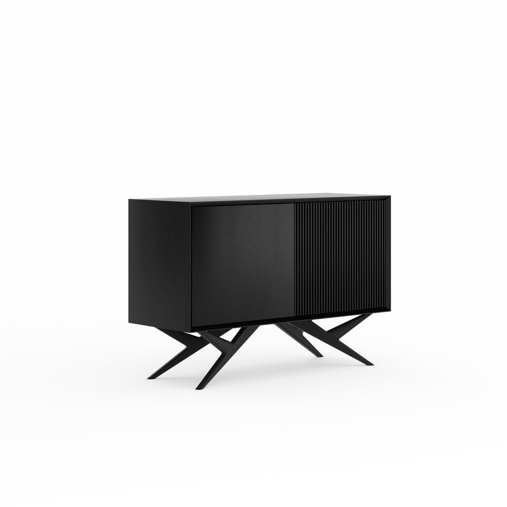 Black oak small cabinet with two slatted doors and organic shape base in mid century modern style, credenza, dresser, commode, TV stand