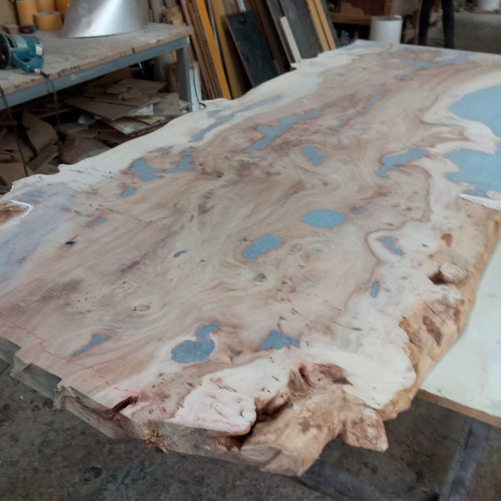 * It is an epoxy dining table made of elm wood.