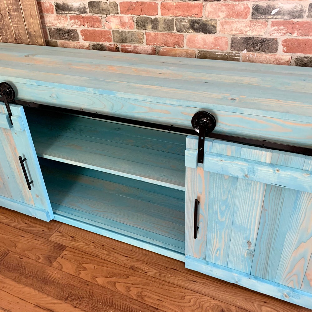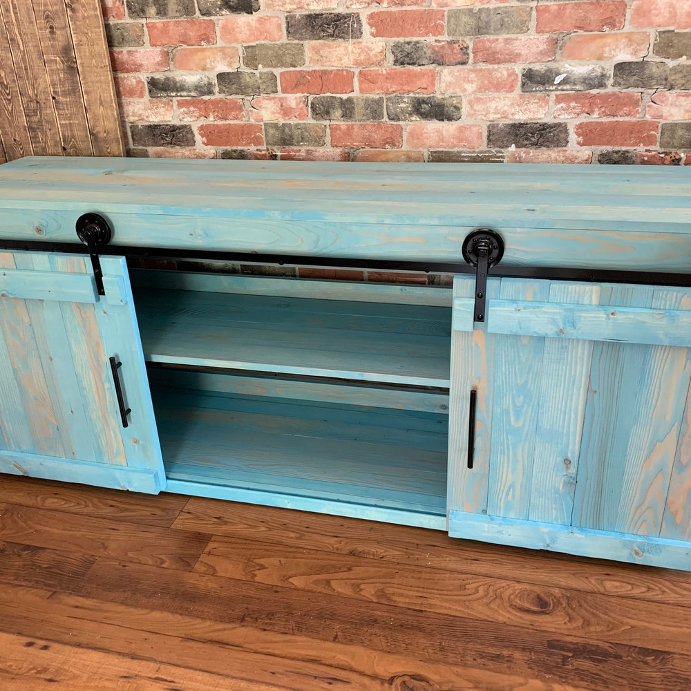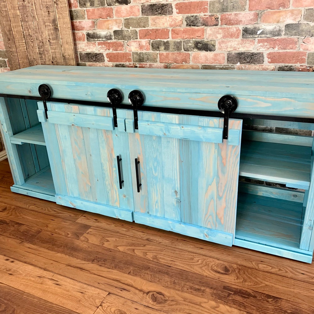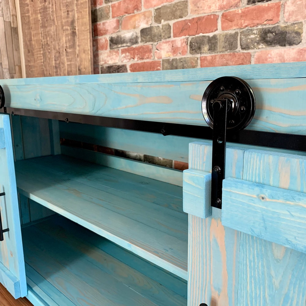 Sliding Barn Doors and metal wheels give this TV Stand its rustic farmhouse appeal.