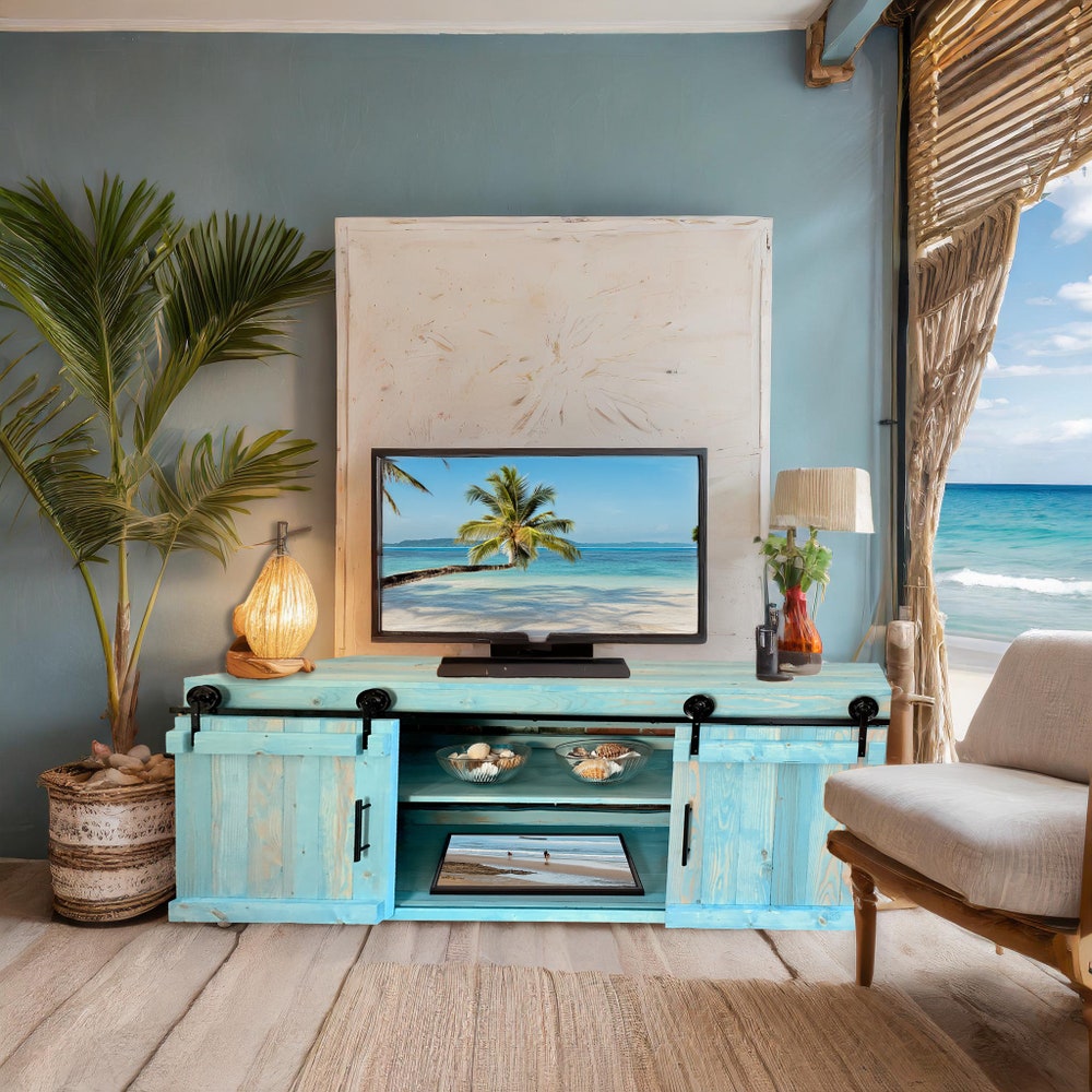 Blue Ocean Beach Coastal TV Stand Console Table with Barn Doors, Entertainment, Bookcase, Cabinet