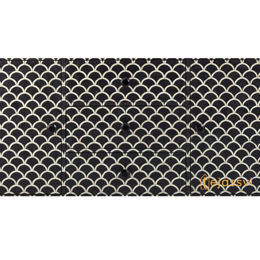 Bone Inlay Media Console | Bone Inlay Fish-scale Scalloped Sideboard in Black Color | Bone Inlay Credenza Indian Luxury Buffet Table.
