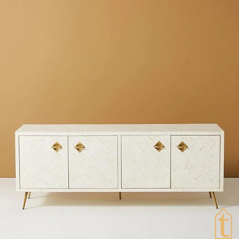 Bone Inlay Optical Design Media Cabinet White, Bone Inlay Optical Design Media Console, Bone Inlay Storage Unit.