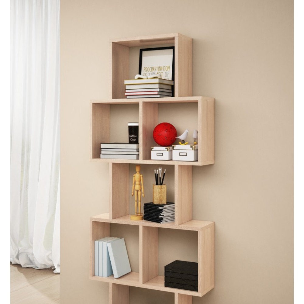 This contemporary asymmetrical bookshelf offers 7 storage compartments that help keep your belongings organized in a living room, home office, or bedroom.this bookcase is sure to be an option that will fit your needs.