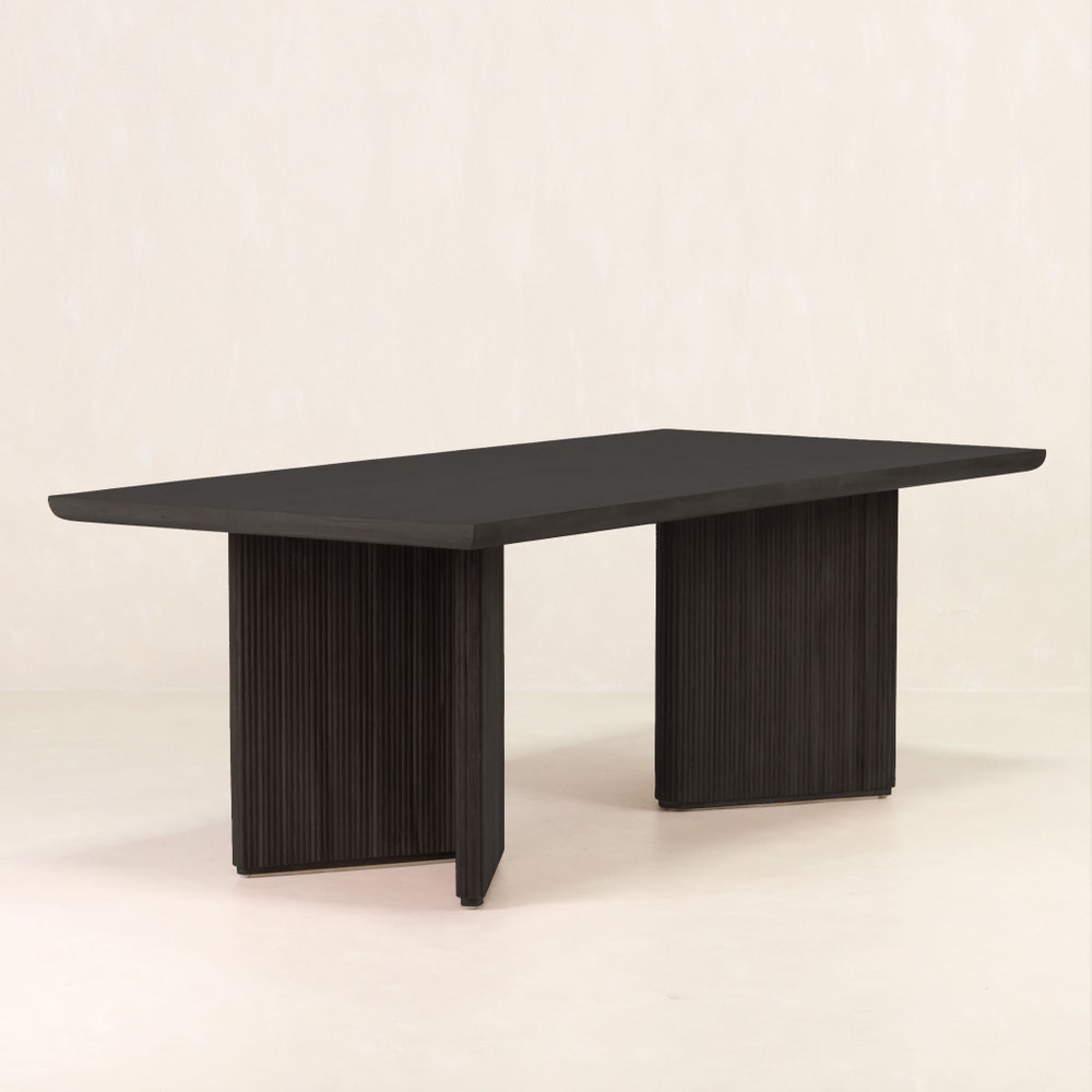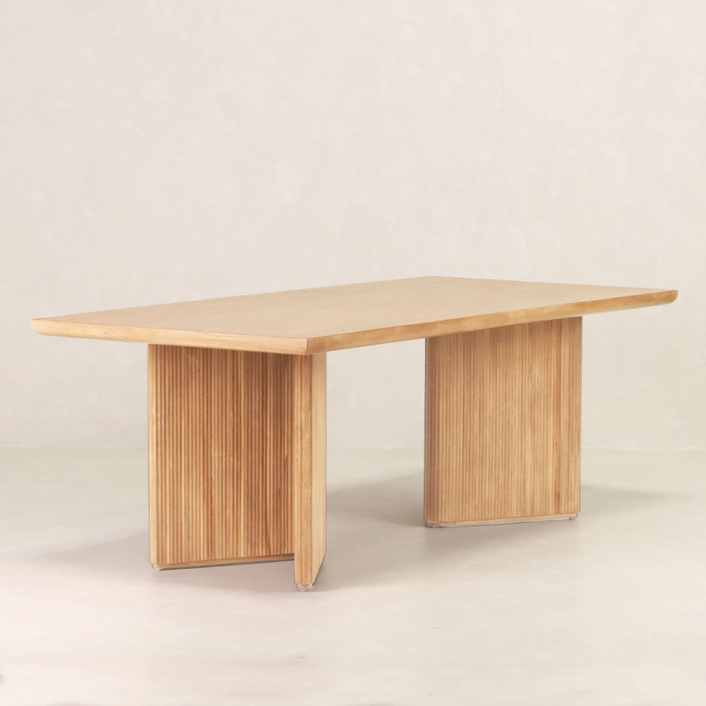 Every angle stuns in this sophisticated statement-making dining table. The angular yet rounded teak veneer top is supported by two boomerang shaped bases framed with a dynamic teak ribbing adding an unexpected texture to the table’s minimal silhouette. A conversation starter and elegant focal point for gathering of friends and family.