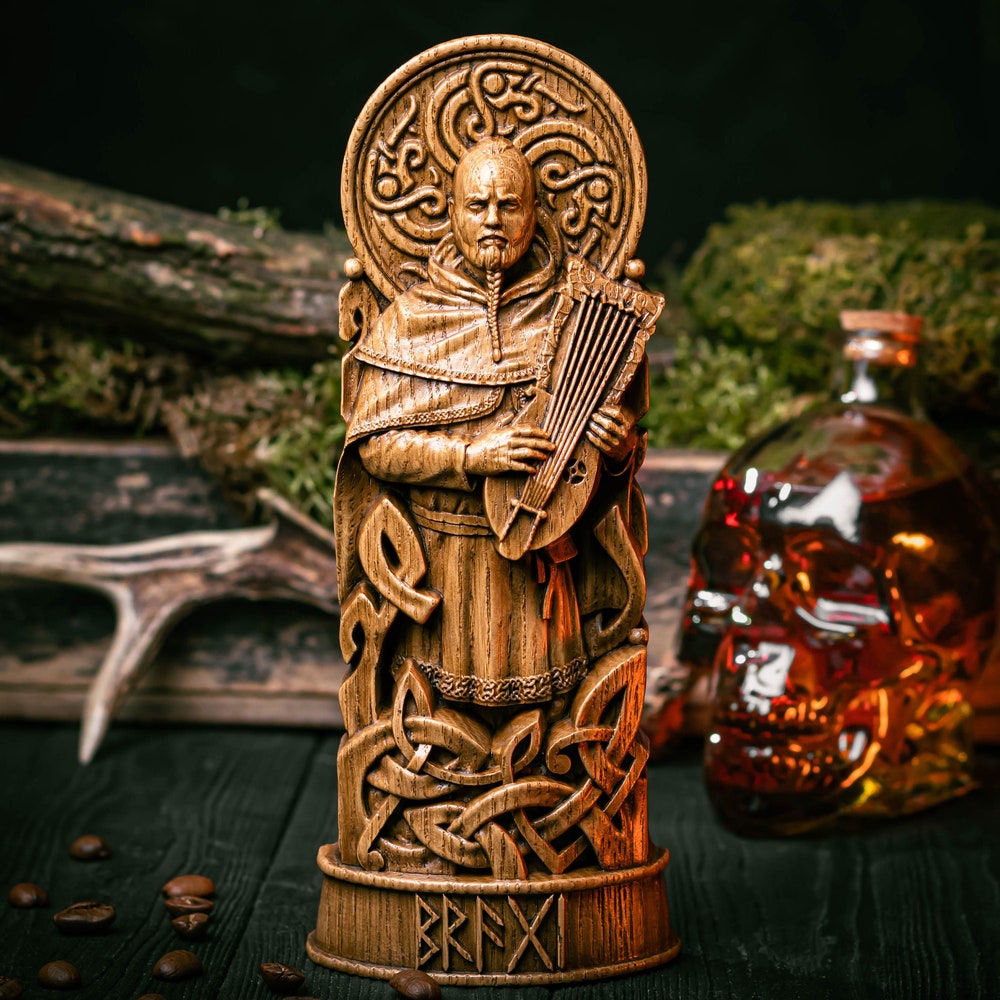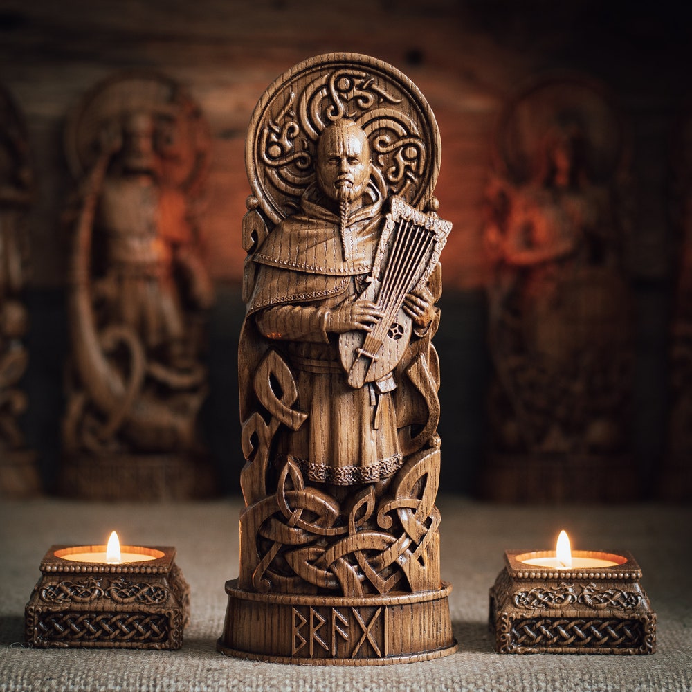 Bragi statue, norse gods, wood carving altar heathen asatru viking god and goddes sculpture wooden scandinavian pantheon