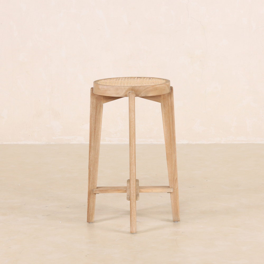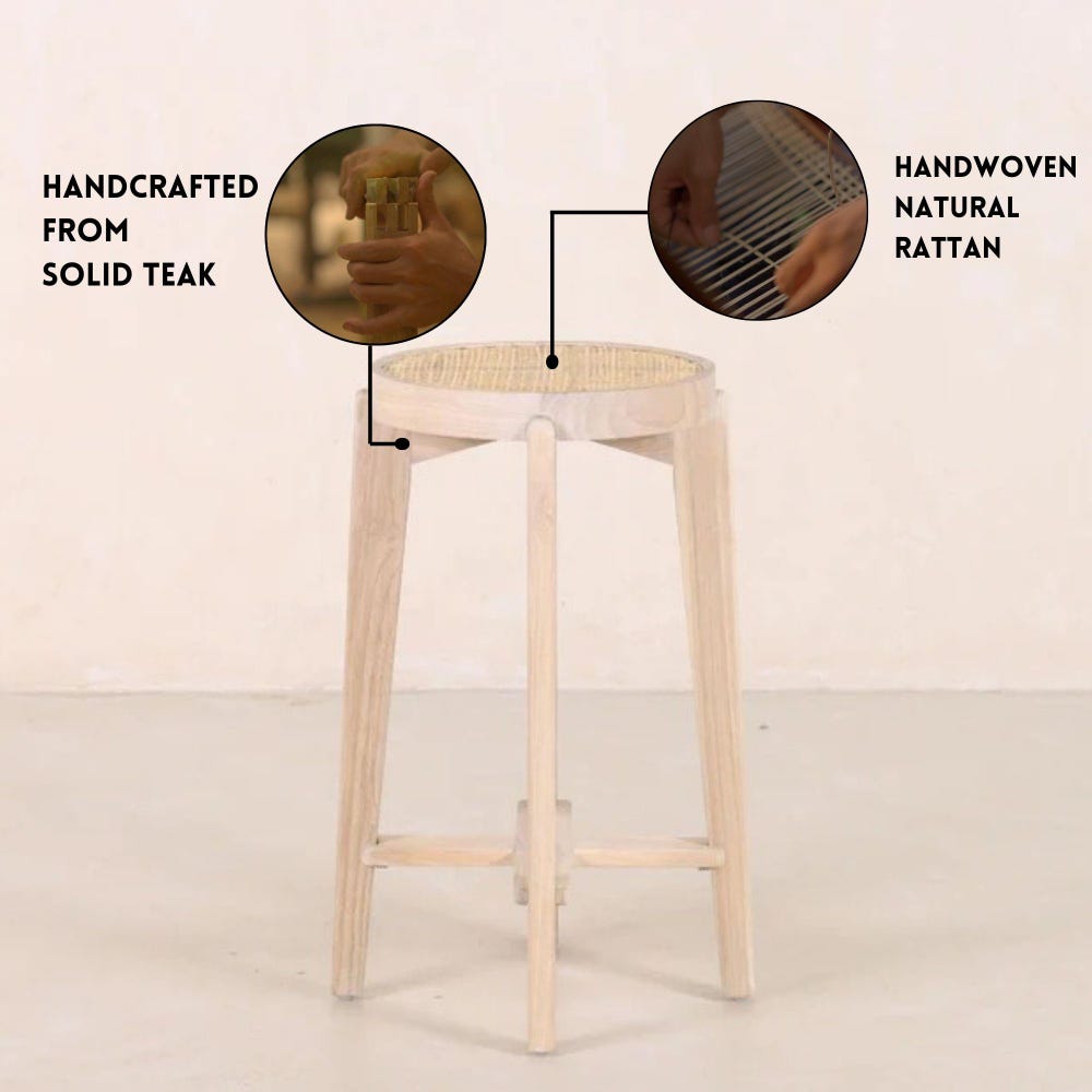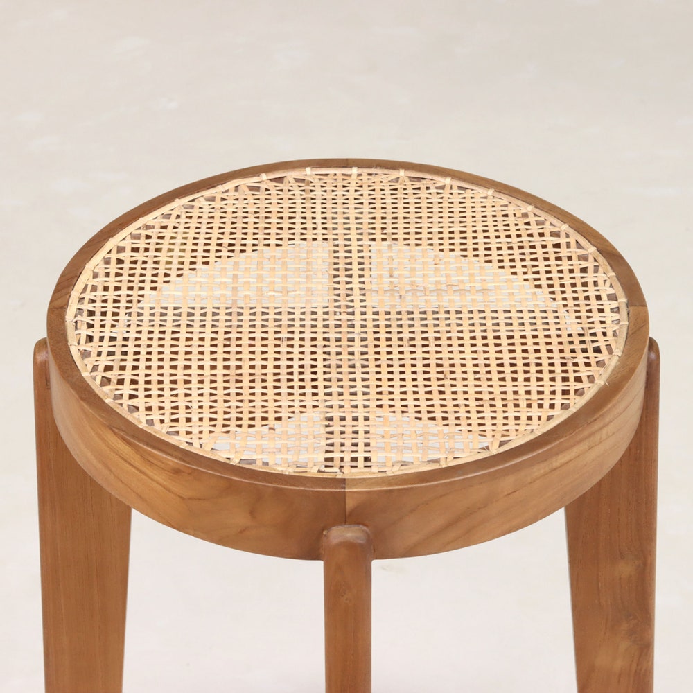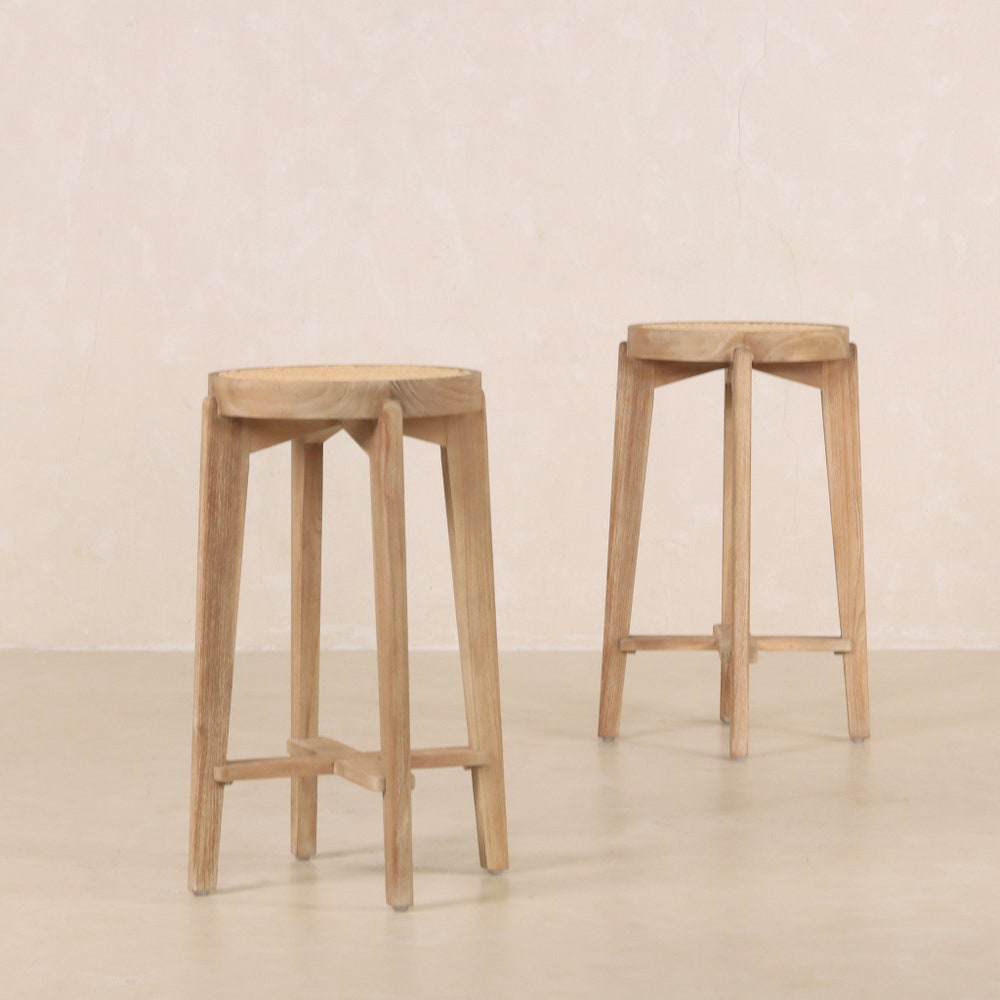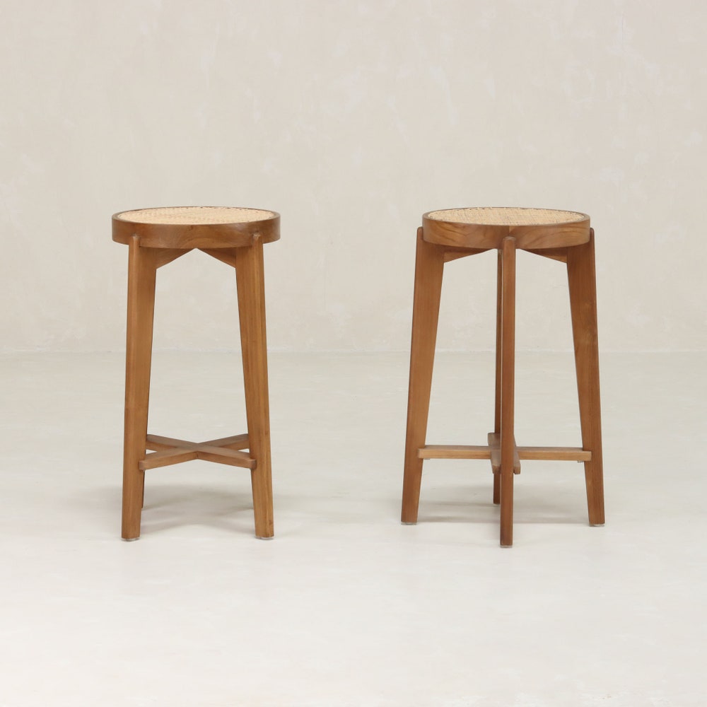 The Cane Counter Stool has a rattan seat in the iconic webbing pattern and solid teak frame. The round seat frame is made of two concentric circles with gently rounded edges. A pair of intersecting crossbars support the legs.