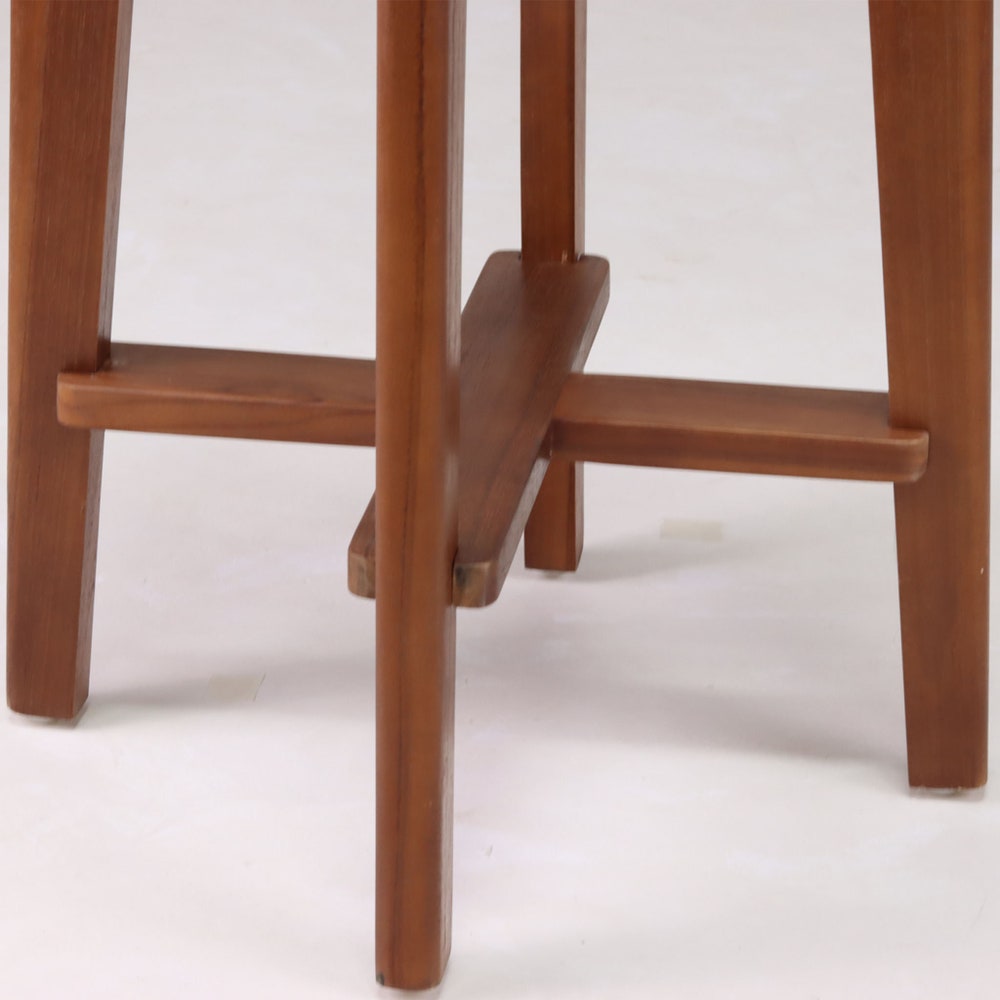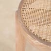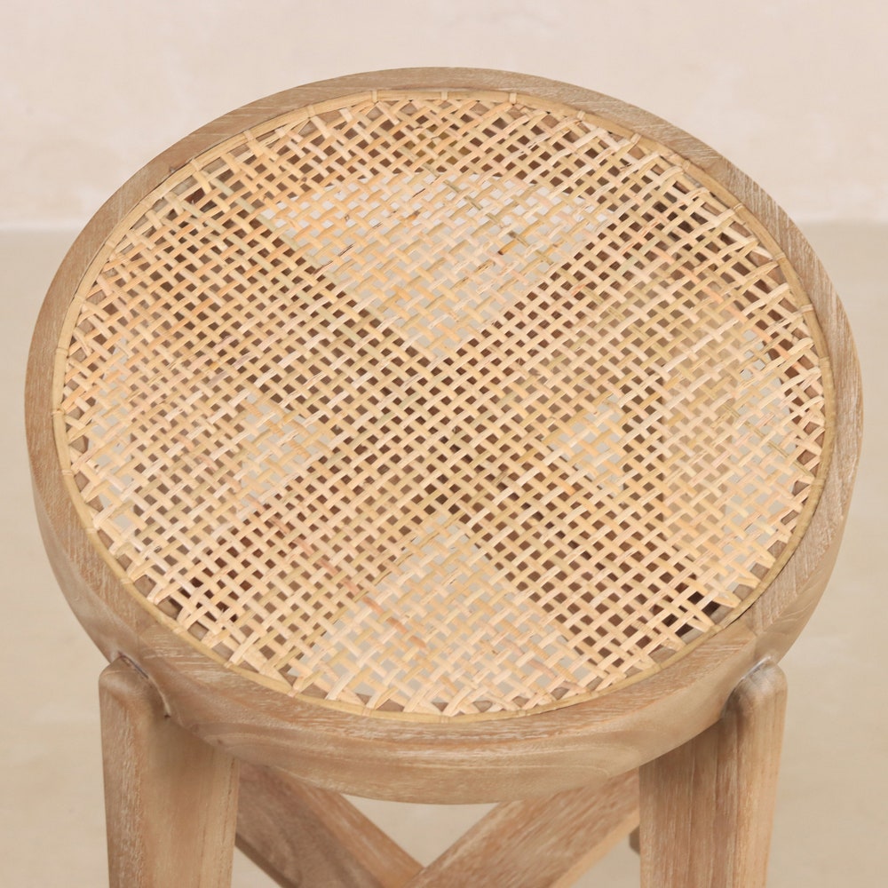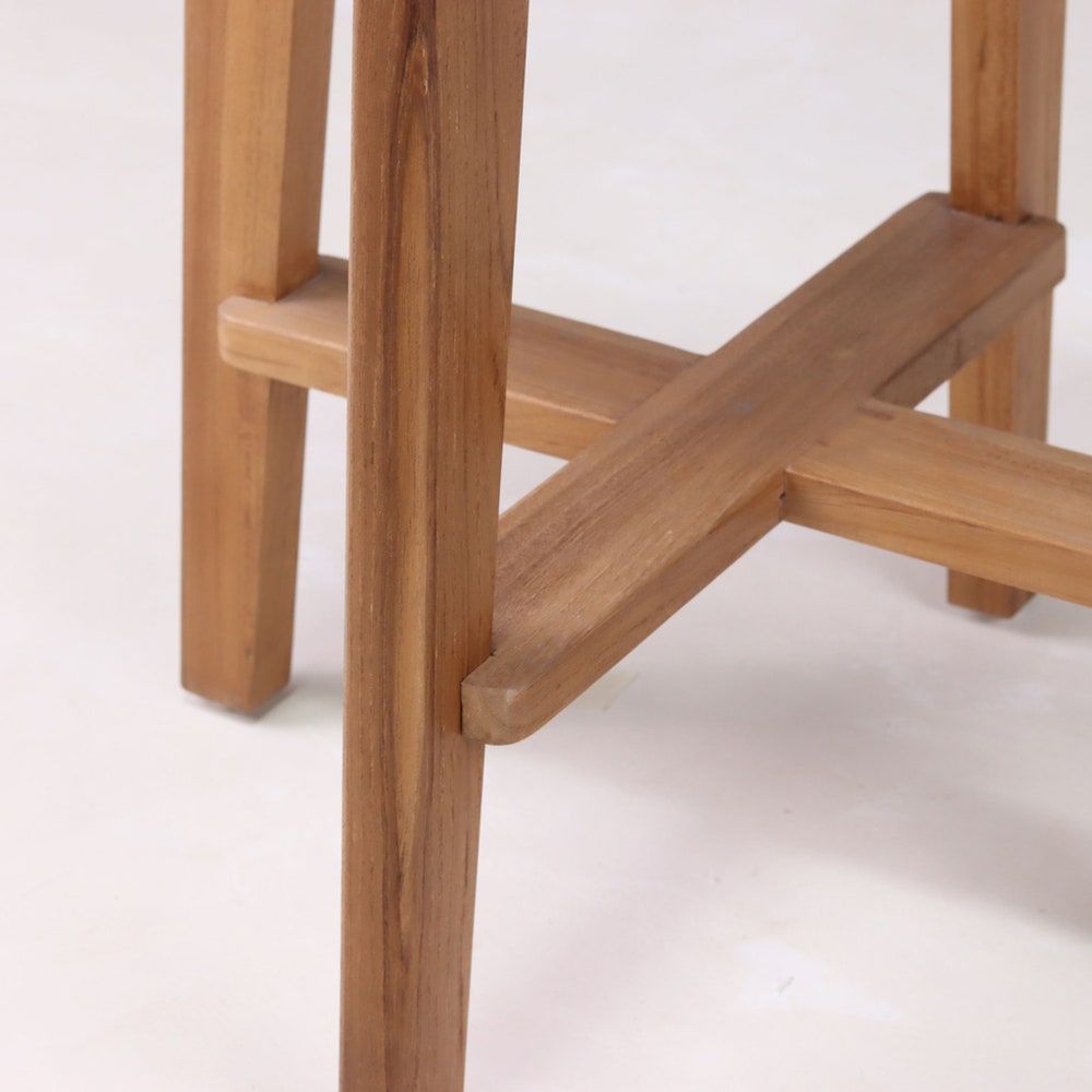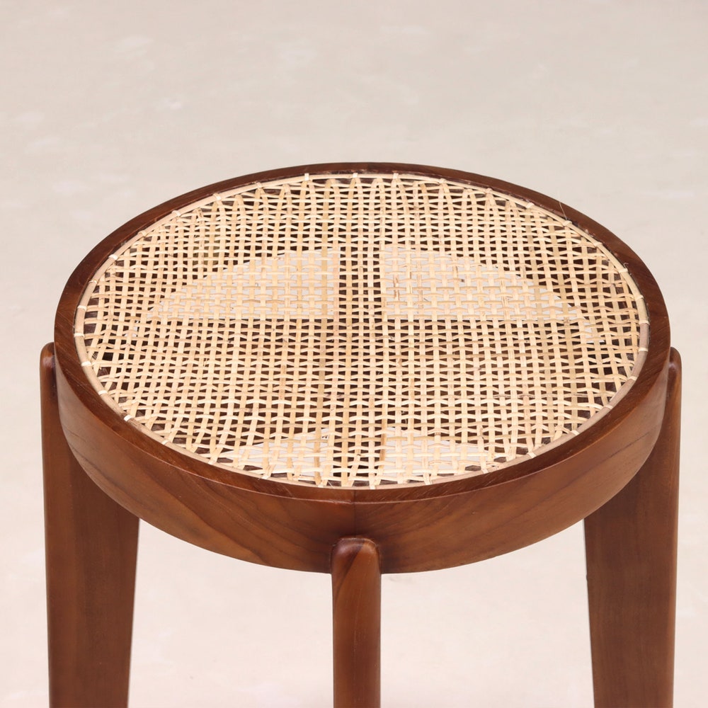 The Cane Counter Stool has a rattan seat in the iconic webbing pattern and solid teak frame. The round seat frame is made of two concentric circles with gently rounded edges. A pair of intersecting crossbars support the legs.