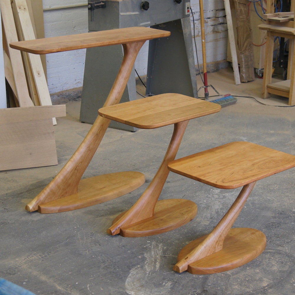 This table was designed and built as a personal challenge to see how far we could take a simple item like a table and simplify it in certain ways. We started out with a few constraints, first we wanted to minimize the number of parts required. The second constraint was that we wanted an item that could flat pack easily and assemble just as easily, to accomplish this, the whole table is put together using our own fastener system that we developed to allow a very strong construction, yet ease of assembly and transport. The last constrain was that we wanted it to have a uniquely handmade feel, this was accomplished by hand sculpting the middle component on this table, this way each item and each person building this item could leave their fingerprint on the final item, while allowing customers a truly unique piece for their collections, while still getting that mid century modern feel.