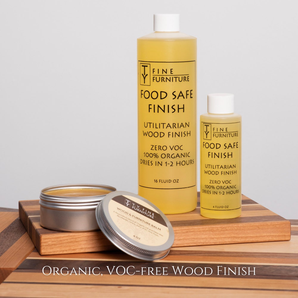 I believe wood should never be stained or sealed heavily. It robs the wood of its beauty and the end user of the pure experience and joy when buying an honestly made piece of furniture. I use my own wood finish which is an Oil+Wax blend. And because I treat my customers as I would my own family, my finish is 100% Organic and consists of only food grade ingredients. Additionally, the finish is incredibly easy to maintain and repair. Here is some more information on my finish: