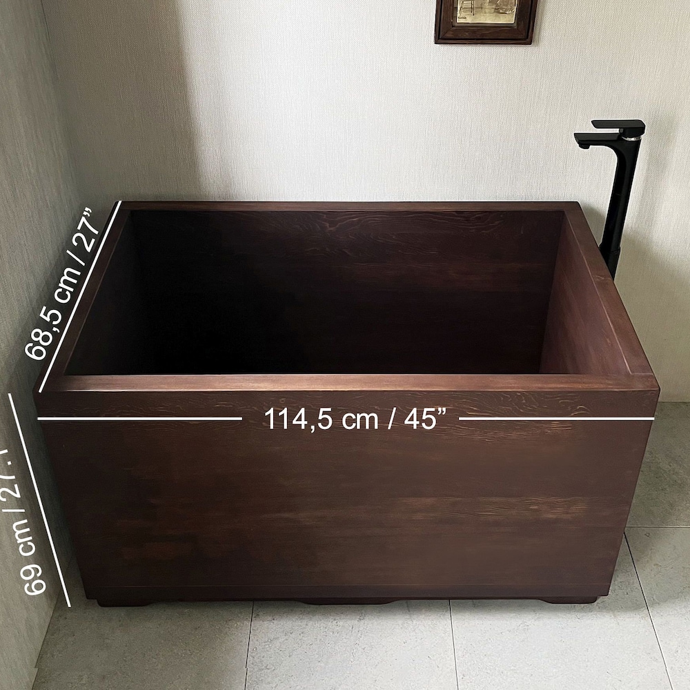 Ofuro Wooden Soaking Bathtub Cedar Wood CustomizableThis wooden Soaking Bathtub is deep and has abundant internal spaceMade in TurkeyMade of endemic Turkish cedar wood, stained with water based chocolate color pigmentsA tub bottom waste drain is includedCustomizableJapanese-styleTraditional and very elegant for modern bathroomsExterior dimensions (WxHxD): 114,5 x 69 x 68,5 cm / 45″ x 27.1″ […]