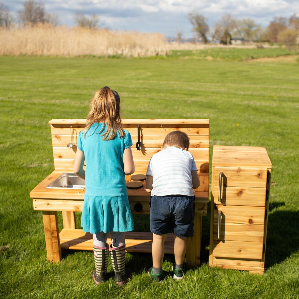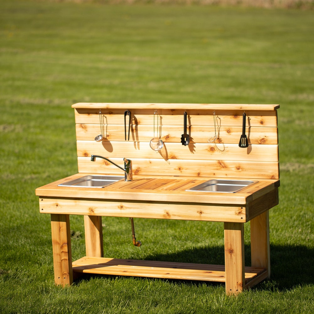 NEWLY DESIGNED Centered Simple Mud Kitchen with a backsplash! -FREE SHIPPING-SUPER DURABLE & WEATHERPROOF: Cedar is naturally rot and insect resistant and will hold up outdoors for years to come!-HANDMADE in our small wood shop in Ontario, Canada-INCLUDES 2 stainless steel sinks-BOTTOM SHELF for extra storage*Pots and pans not included. ADD-ONS: Choose your Faucet: No […]