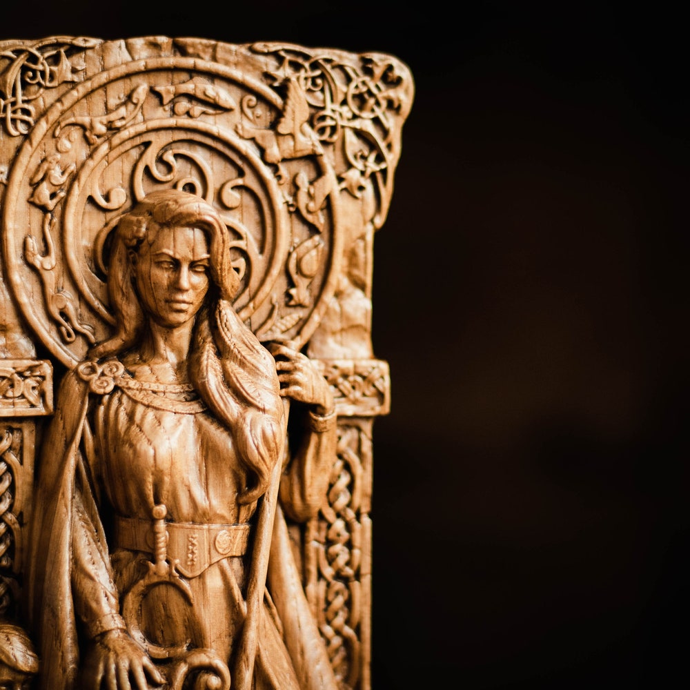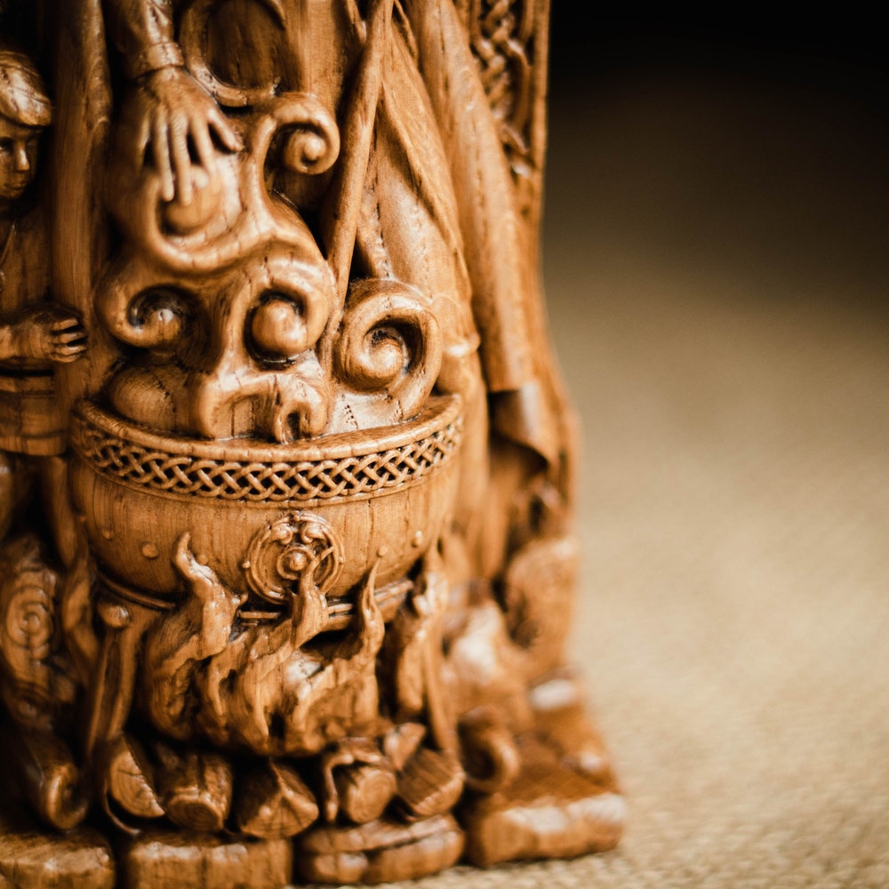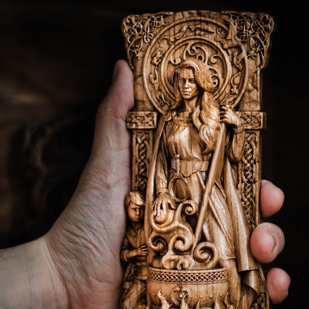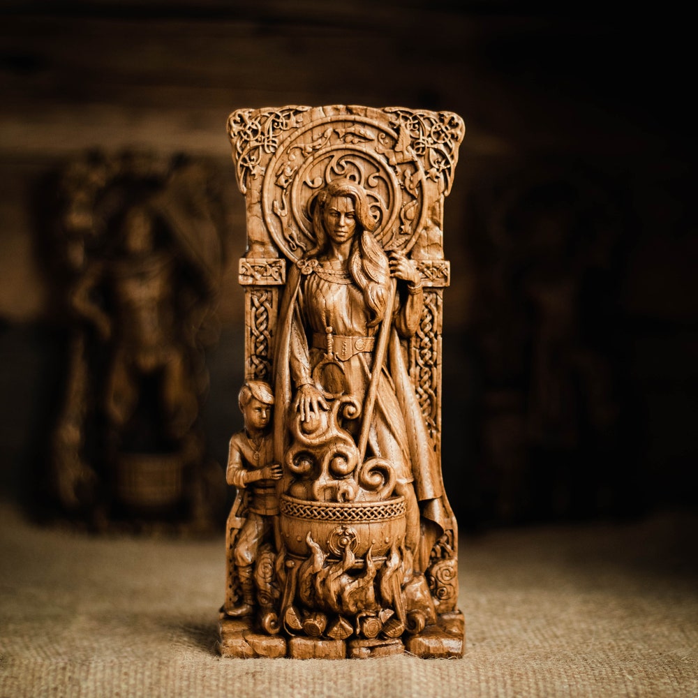 Bragi statue, norse gods, wood carving altar heathen asatru viking god and goddes sculpture wooden scandinavian pantheon