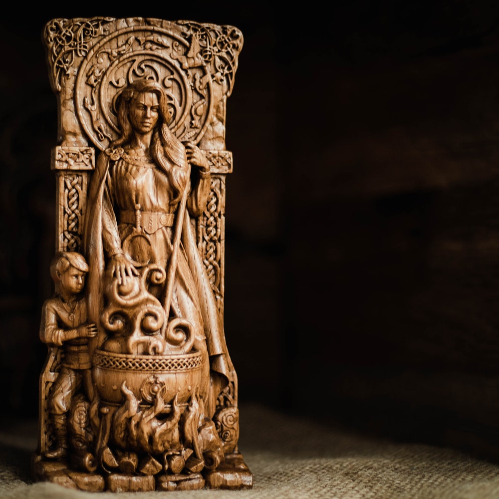 Handmade wooden statuette of Ceridwen carved out of oak wood.