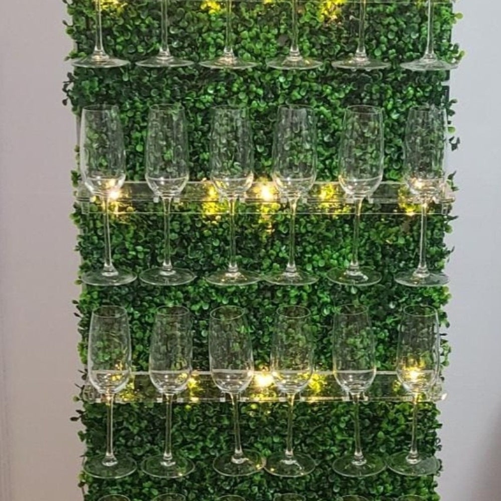 Champagne Wall with Lights, Champagne Glass Holder, Hedge Greenery Champagne Bar | Wedding Prosecco Display Decor