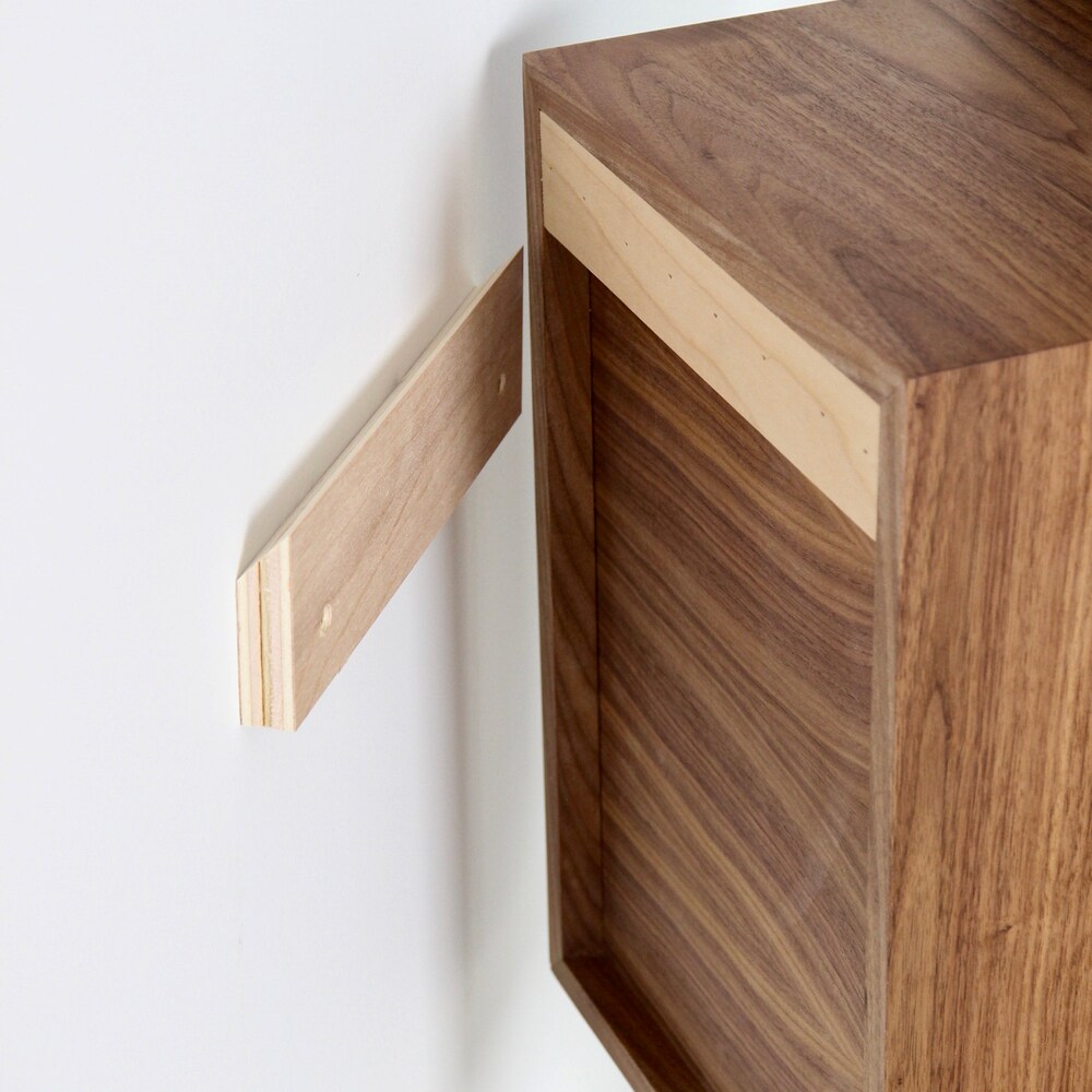 These wall-hung record shelves are built from solid American Cherry and feature wrap-around grain across the top and sides. Clean, elegant and Mid-Century modern inspired.