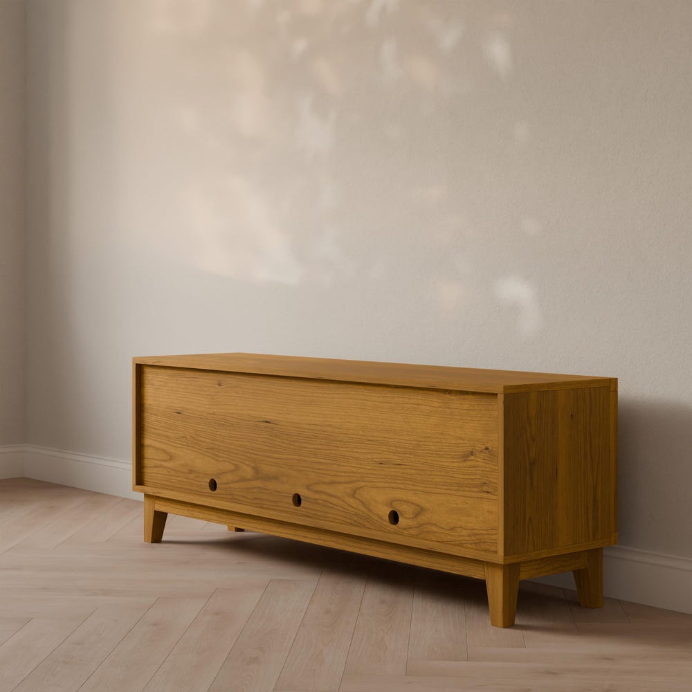 The 3/4″ doors are hung on soft-close Blum hinges. Behind each door is an adjustable shelf. We’ve included holes in the back of each section of the cabinet for cord management.