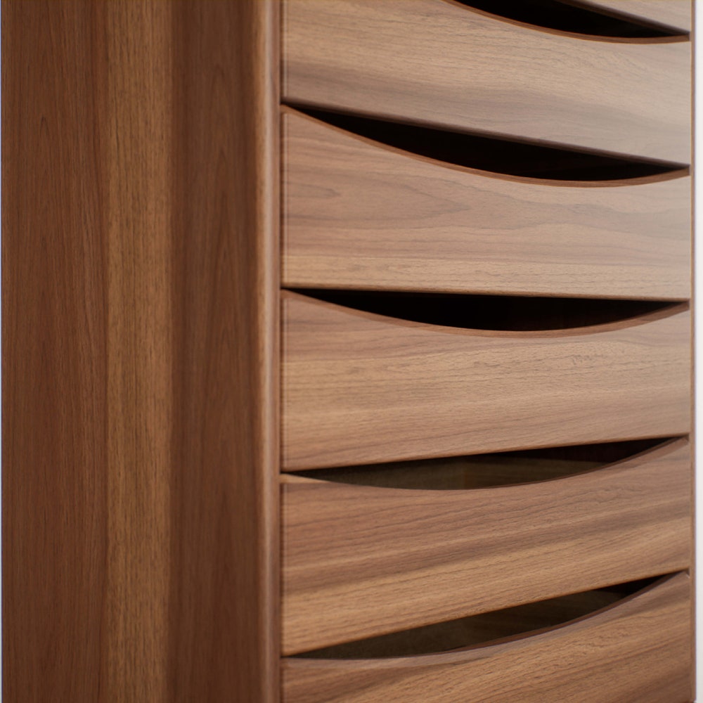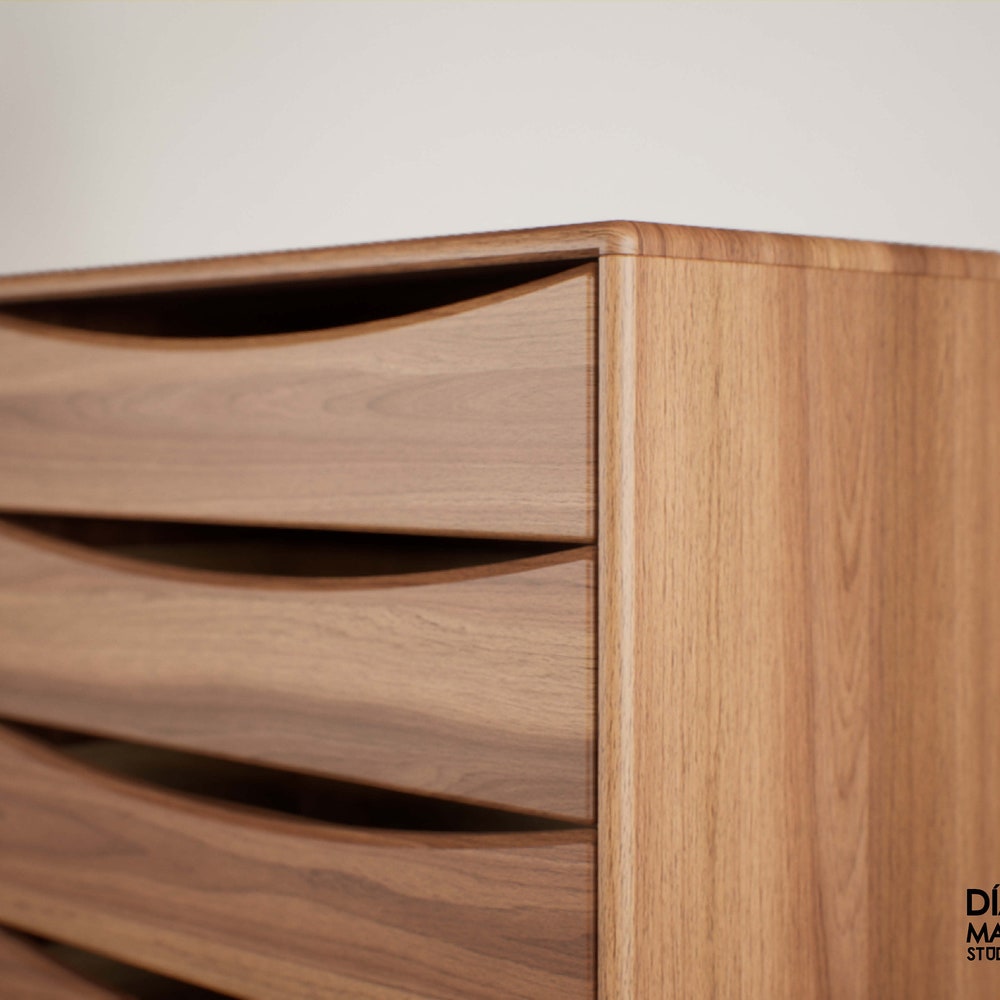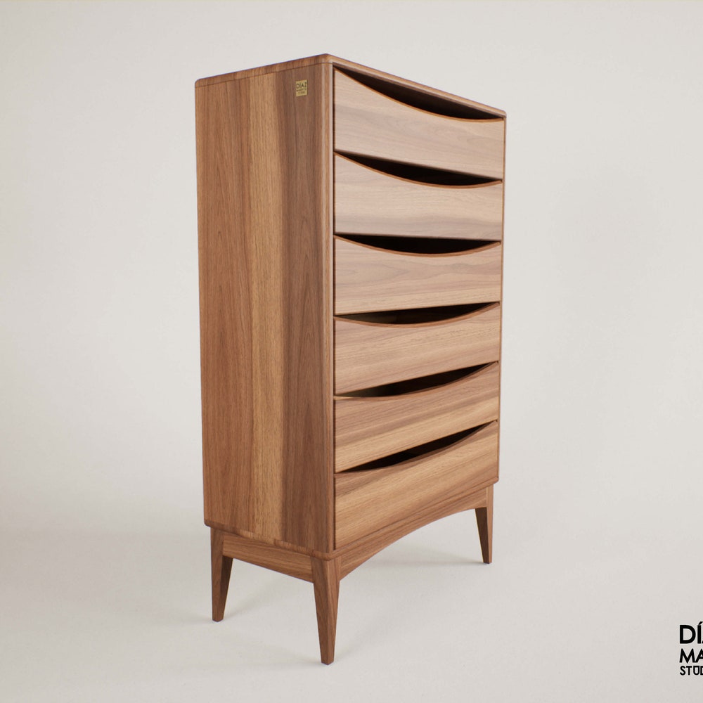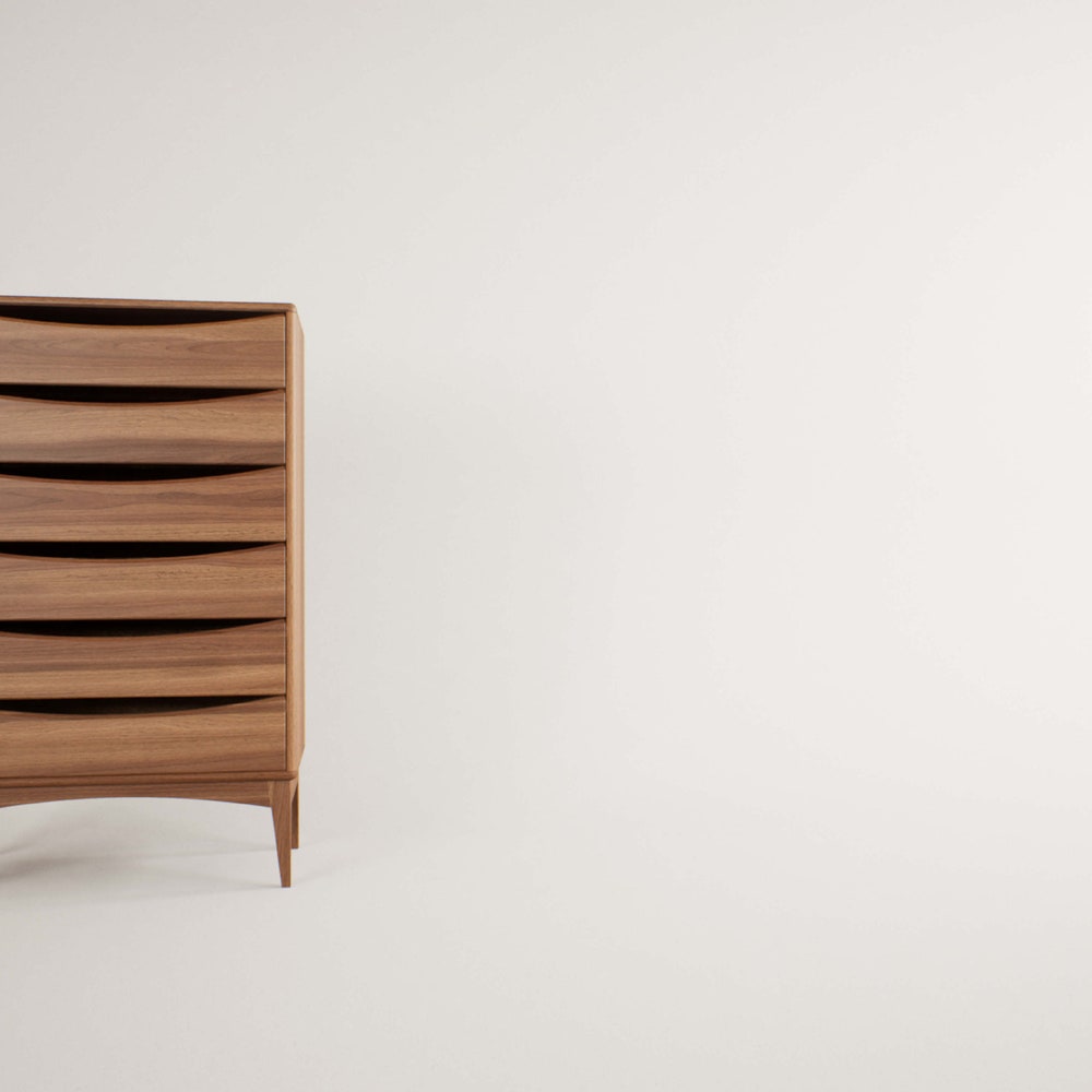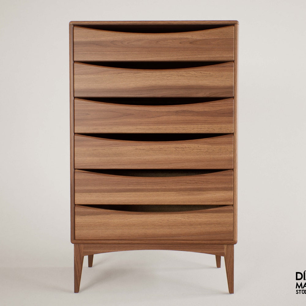 Chest of drawers made of American walnut wood consisting of six drawers. The arch that forms each drawer allows you to put your hand inside to open it.