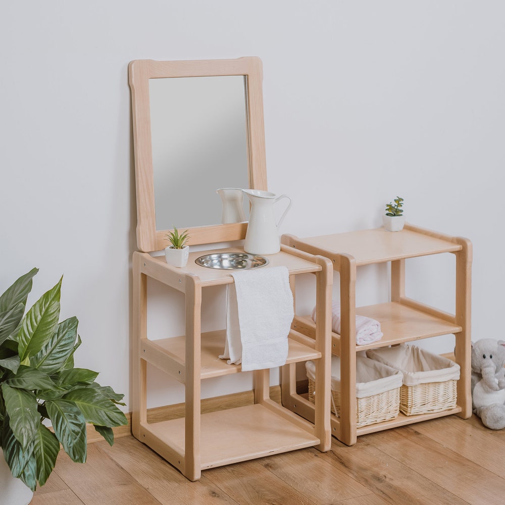 Introducing the Montessori Washbasin Type A by Woodjoy. This compact and purposeful washbasin empowers your child to independently engage in everyday self-care tasks such as washing hands, brushing teeth, and grooming, without the need for a stool. The Montessori Washbasin Type A boasts a unique feature—an opening in the front thoughtfully designed to hold a towel, enhancing convenience and promoting your child’s self-sufficiency. Rooted in Montessori philosophy, our furniture is meticulously designed to be functional and tailored to your child’s needs, interests, and age, fostering a sense of autonomy and accessibility to their belongings. The versatility of our Montessori Washbasin extends beyond its primary purpose. When the washbasin phase concludes, a new upper board can be purchased from us, transforming it into a Woodjoy SMALL Shelf. This seamless transition aligns perfectly with the Montessori approach, ensuring that the furniture grows with your child’s evolving needs. Enhance your setup with our Montessori-based Small Mirror and the Montessori SMALL Shelf for a harmonious and functional environment.