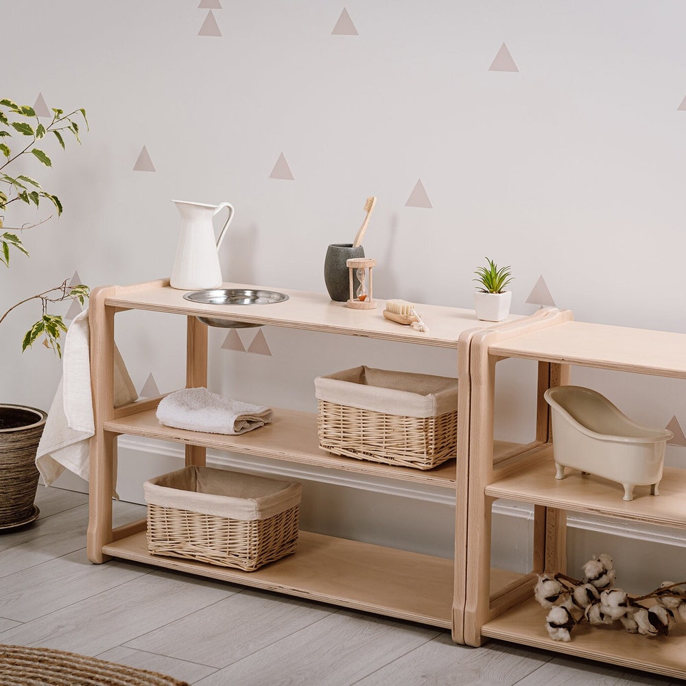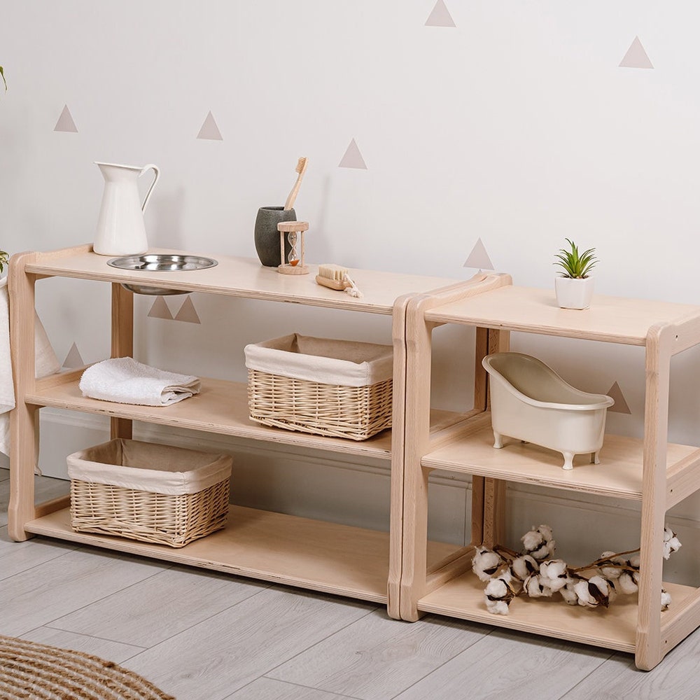 Nurture your child’s independence with Woodjoy’s Montessori Furniture Set, featuring the Montessori Washbasin Type B+ and the Montessori Small Shelf. This thoughtfully designed set provides the ideal environment for your child’s self-care and play. This spacious and functional washbasin empowers your child to wash hands, brush teeth, and groom independently, eliminating the need for a step stool. It incorporates a convenient front opening for easy towel access and includes side storage space for essentials. Our Small Shelf is a low, open shelving unit with three levels, perfect for storing toys and books. Its deep shelves can easily accommodate larger toys and accessories, promoting your child’s development through organized play.