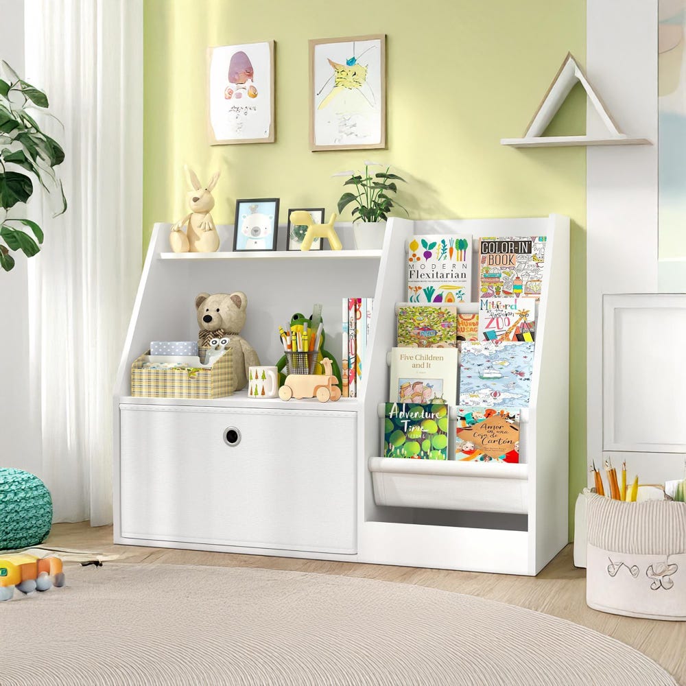 Design: Features 2-tier open shelves, 4 sling-style fabric book pouches, and 1 spacious bottom drawer