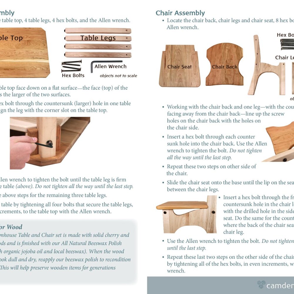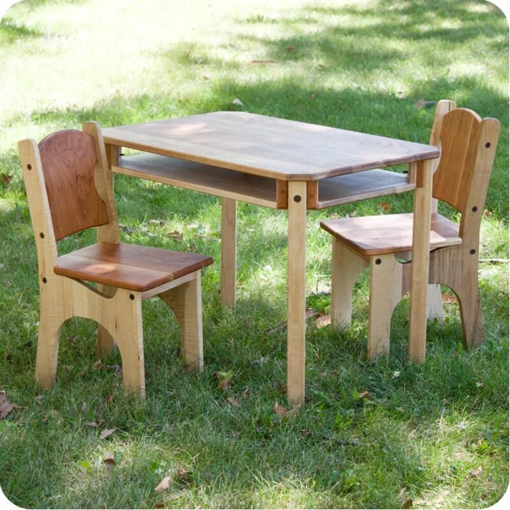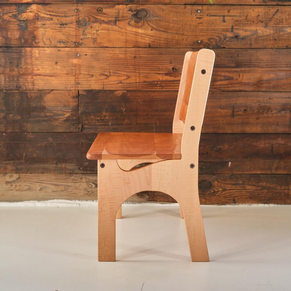 Made of heirloom quality, solid maple and cherry hardwood, this table and chair set will be enjoyed by multiple generations. We incorporate a timeless, contemporary design with rounded and sanded edges, and then finish it with our Three BEEautiful Bees All Natural Wood Polish, created with certified organic jojoba oil and pure beeswax.