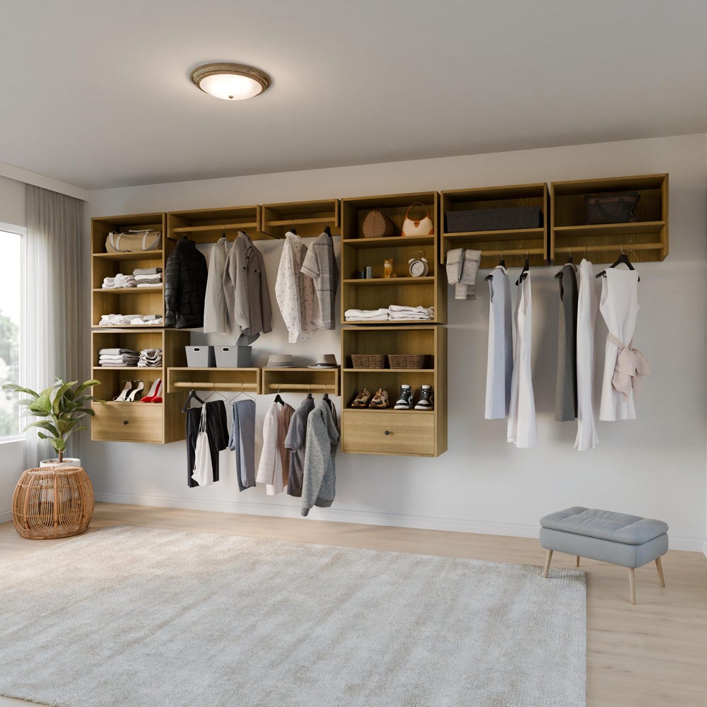Our modular shelf and drawer system arrives fully assembled with easy to follow install instructions. Hung in minutes, these racks are amazingly strong and will elevate any space. Combine with our Clothes hanger shelves for a complete closet collection. If our 5 sizes do not quite fit your space, please contact us for customization.