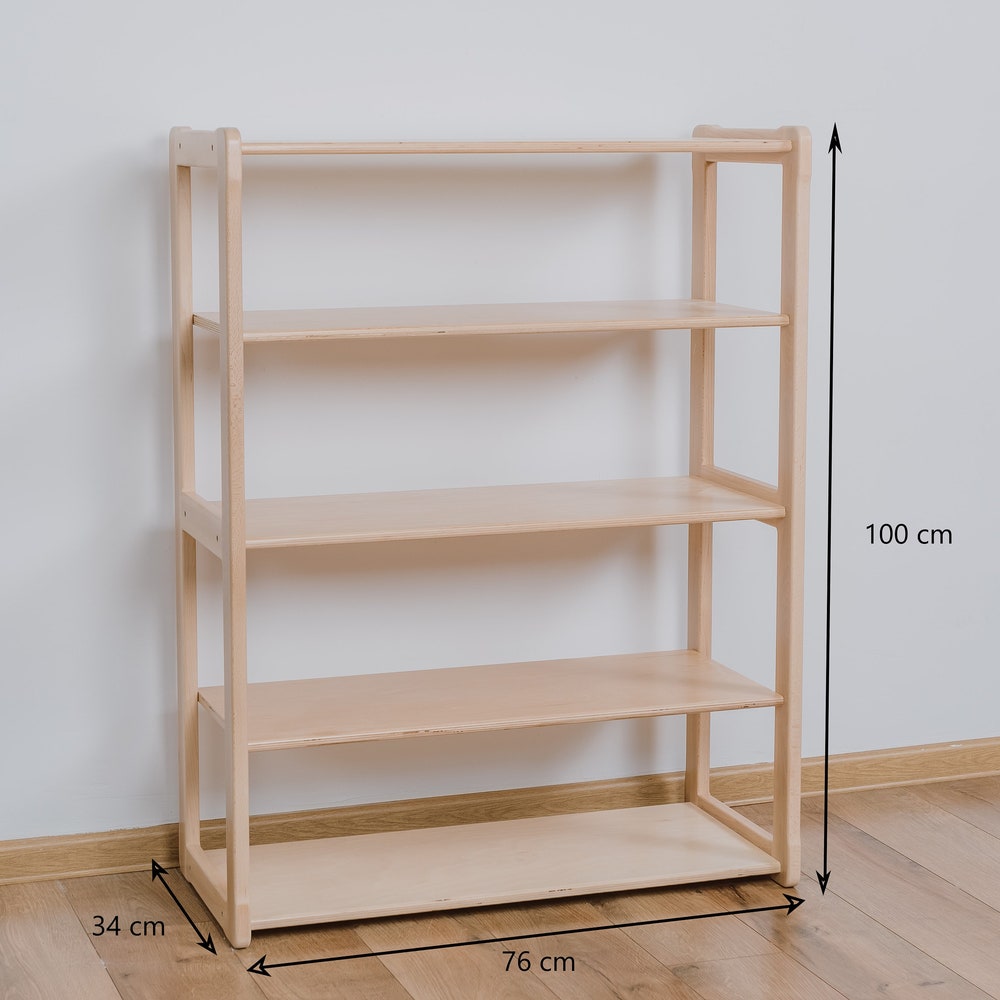 From toddlers to young children, our Clothing rack type B with shelf is tailored to their height, enabling them to select their outfits and maintain tidiness in their personal space. It encourages kids to organize their clothes and learn crucial self-care skills like dressing independently. The added shelf provides even more storage options, making it easy to keep essentials within reach. This clothing rack complements our Montessori MAXI+ Shelf, offering the same measurements and seamless integration for extra storage space.