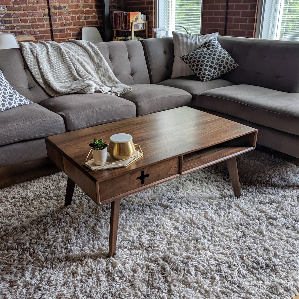 The retro Coffee Table “Plus” consists of one sliding drawer, tapered legs, and the distinctive “Plus” hand hold cutout. It is made to last from solid walnut with a stunning satin finish. The drawer body is made from solid maple and connected with a beautiful dovetail joint to create a lovely contrast. The drawer face is slightly recessed to blend cleanly with the beveled inside edge. The Coffee Table “Plus” also features solid legs that are easy to mount, but won’t wear out over time like you see from the flimsy metal mount brackets on so many other mid century style products.