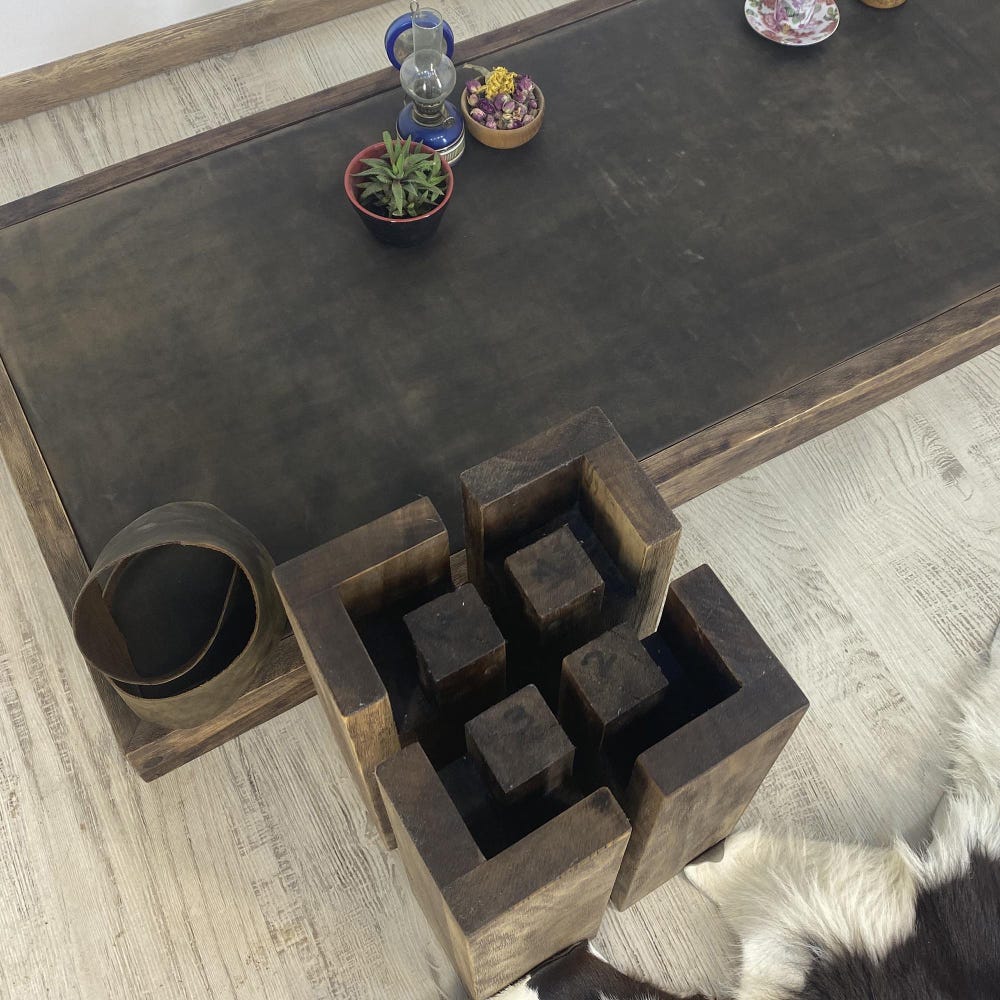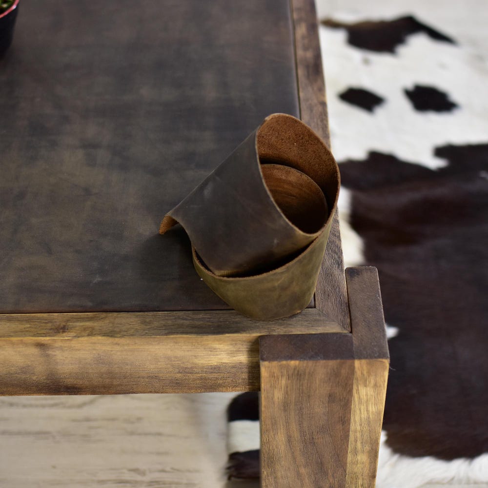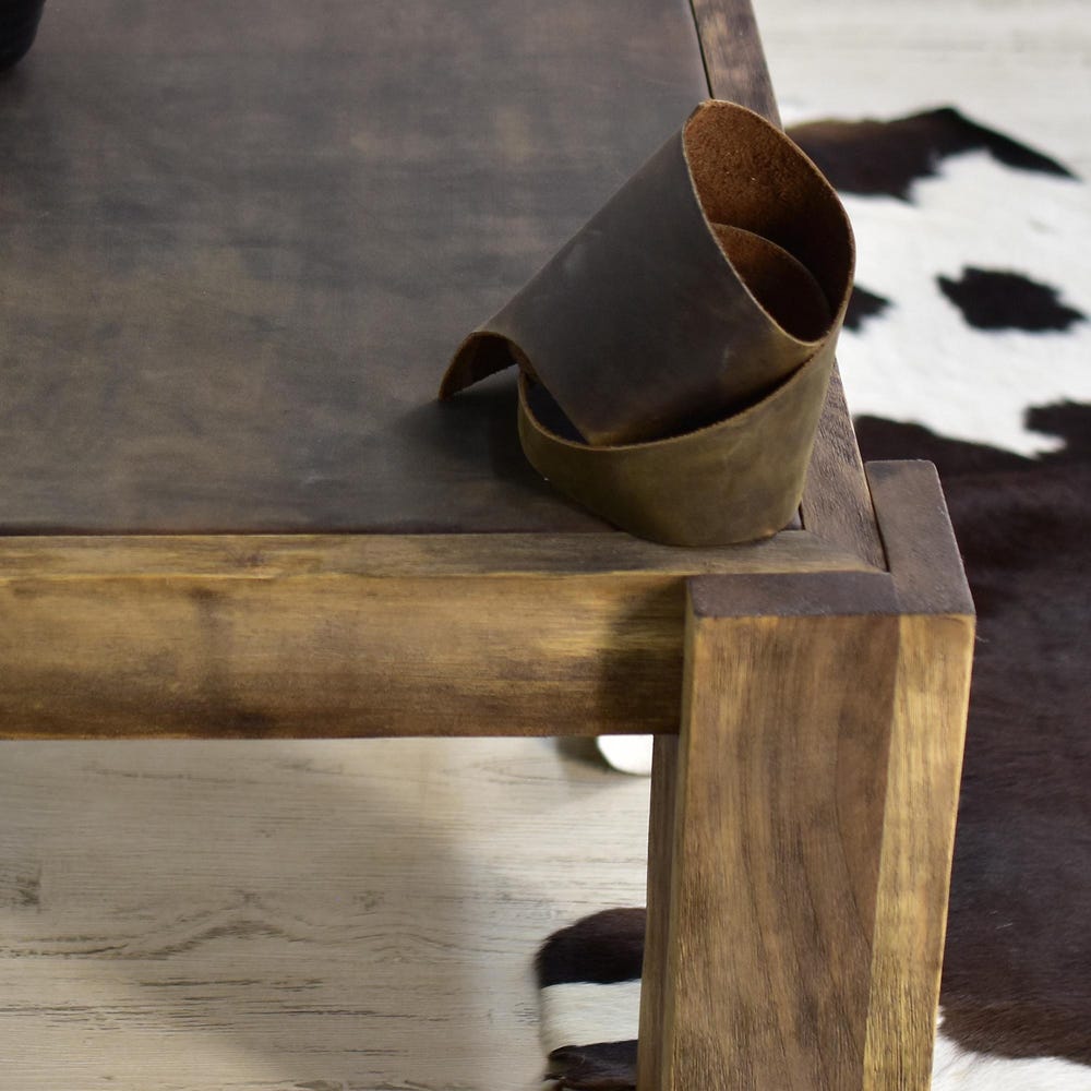 Walnut wood and leather come together in the rustic coffee table.
