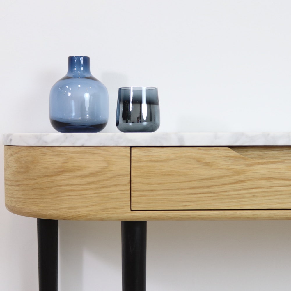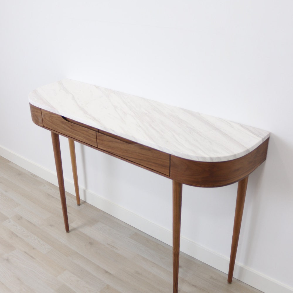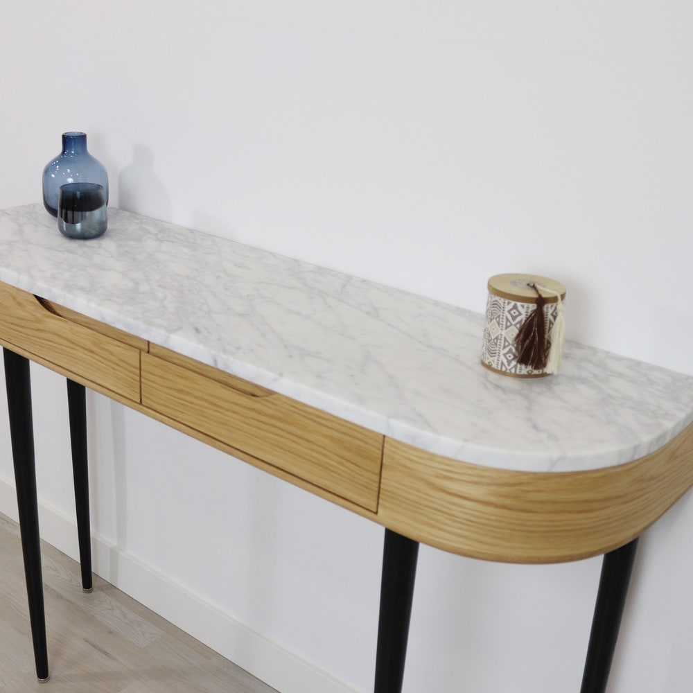 Console Table, entryway furniture with 2 drawers and 4 Legs in solid American Oak or Walnut with Marble top