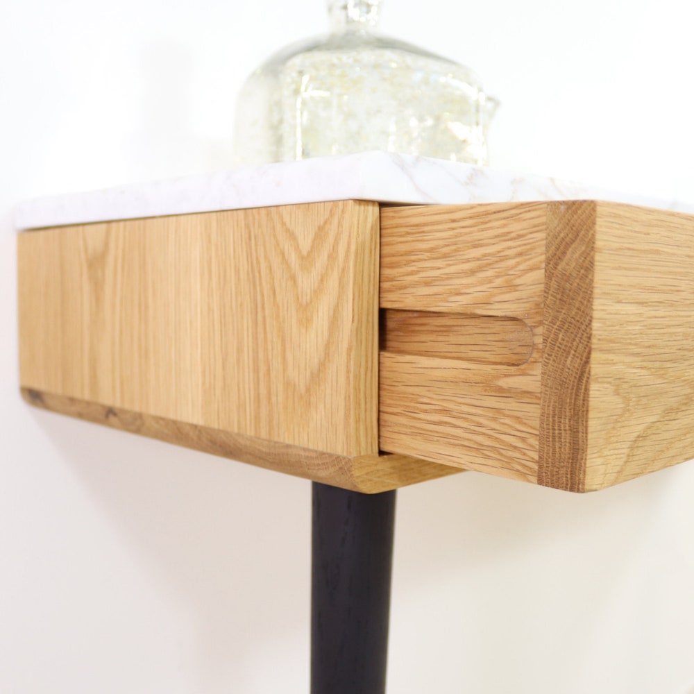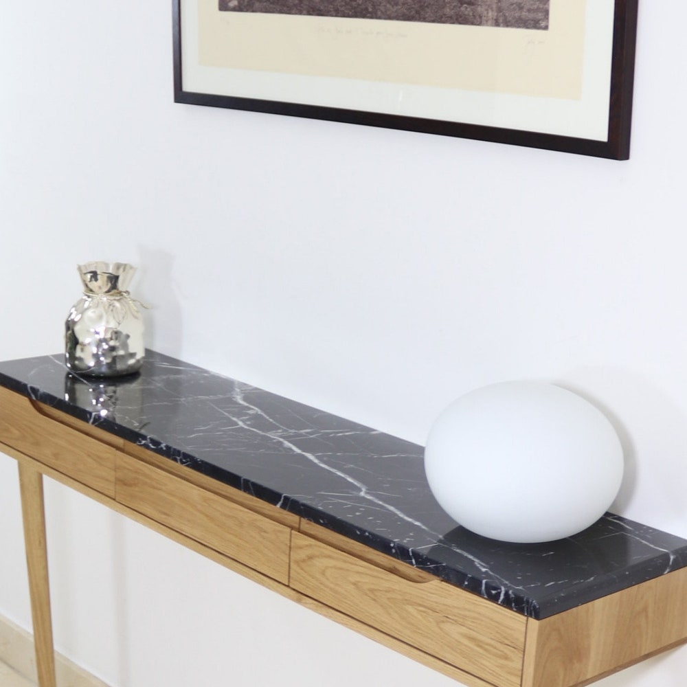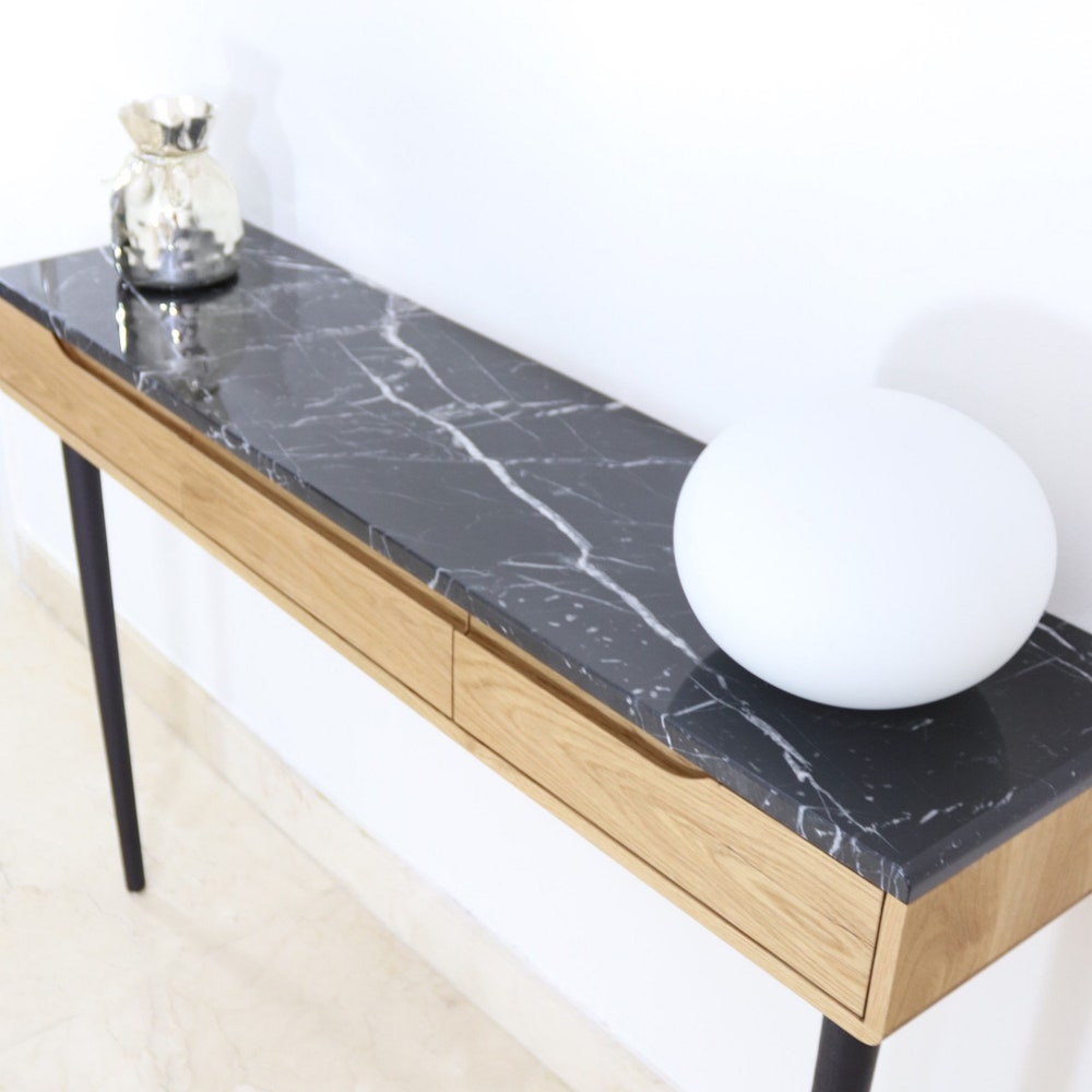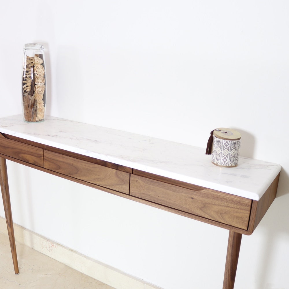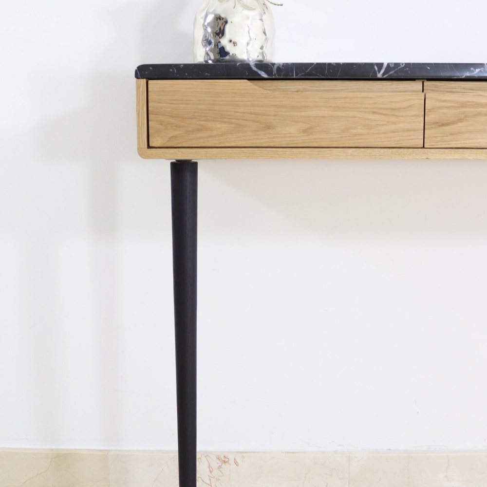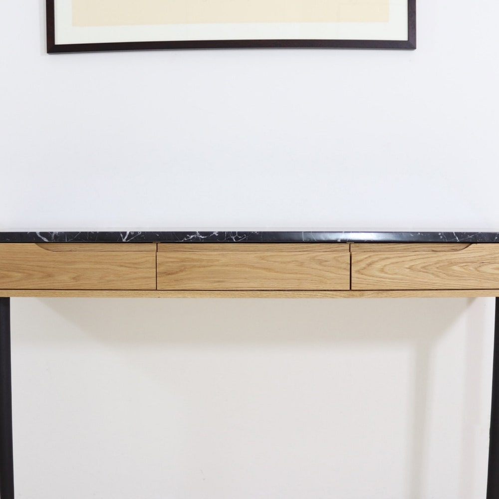 Console table with drawers in Oak or Walnut with marble top.