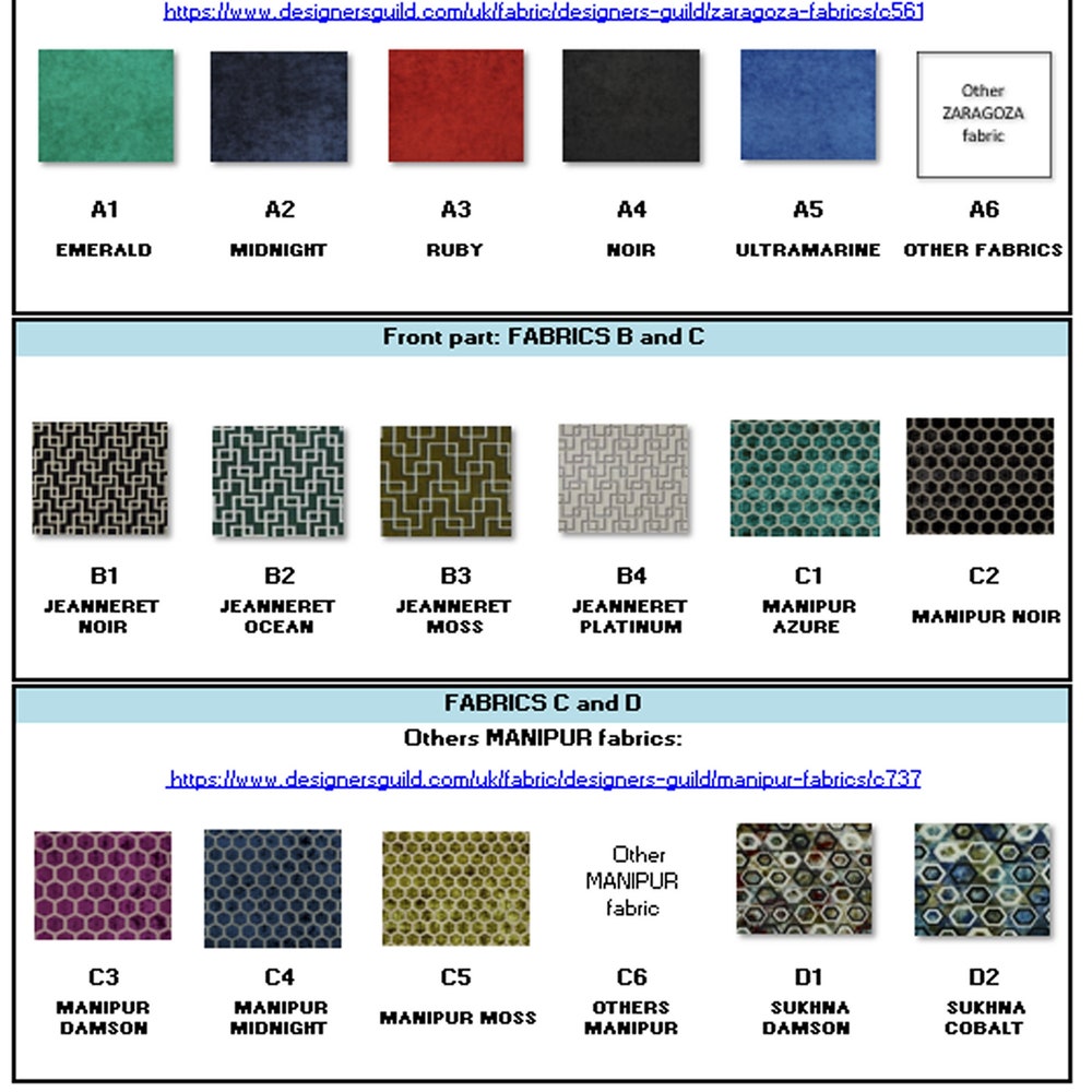 Zaragoza fabrics, An altogether sumptuous, softly luxurious, and timeless upholstery fabric, has 60 colors, PLEASE When you check option “A5”, indicate the color you have chosen. You can find all the fabrics at the following link: