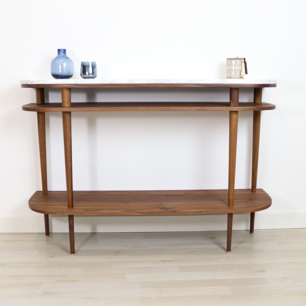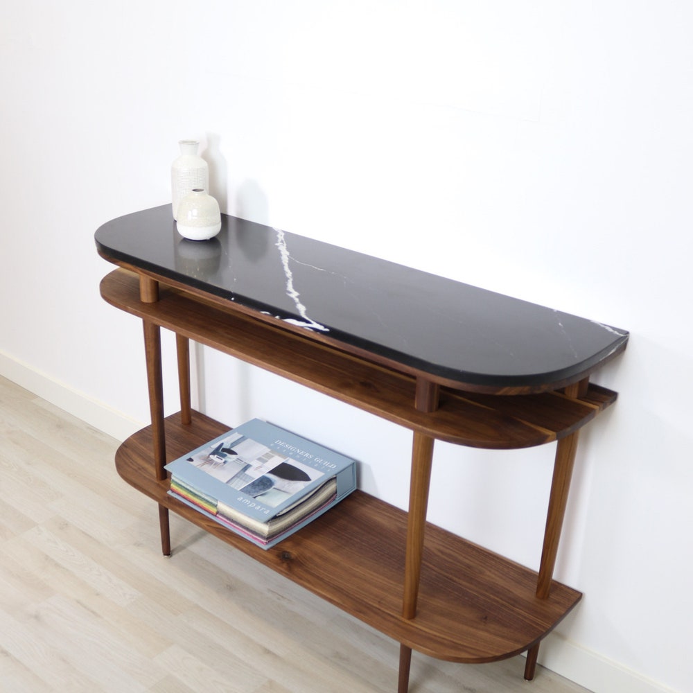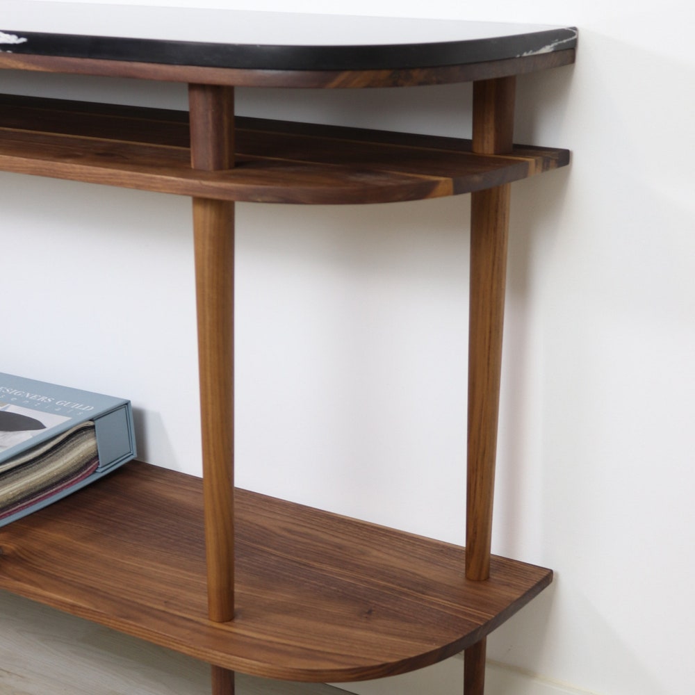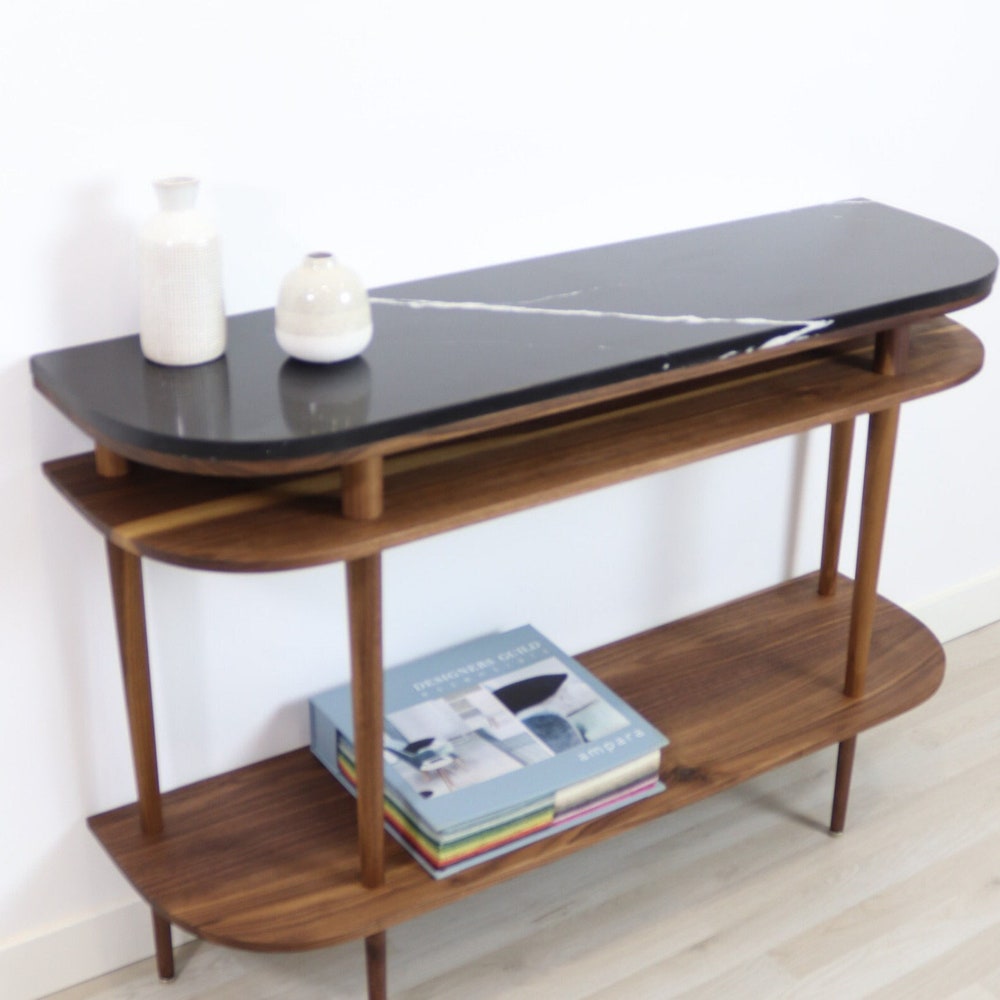Console table with shelves in solid American Oak or Walnut and marble top.