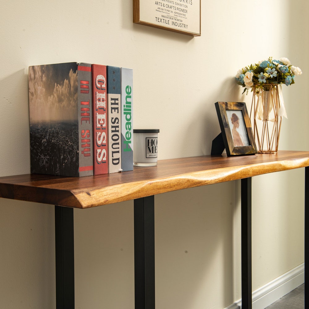 Modern, sleek, and ready to ship, this live edge sofa table is the perfect companion to any couch or hallway. Its modern-industrial design is made to last with premium South American walnut (Samanea saman) and a zero VOC (non-toxic) topcoat with the hardness and durability of a traditional lacquer or polyurethane. Our eco-friendly and sustainable walnut comes from managed forests that are in compliance with environmental law.