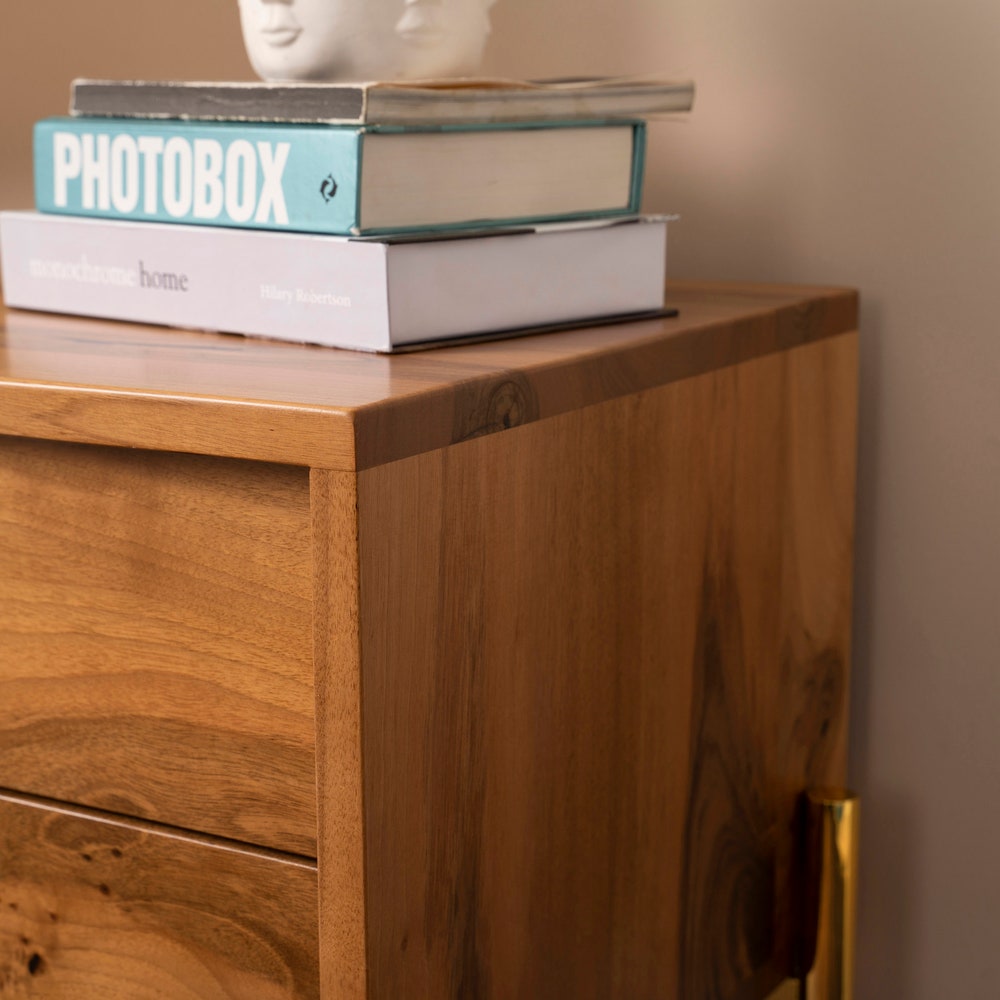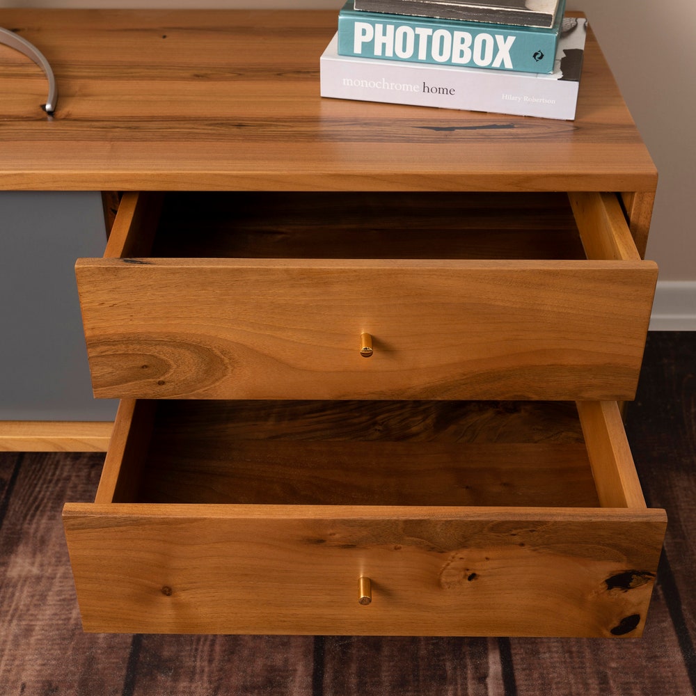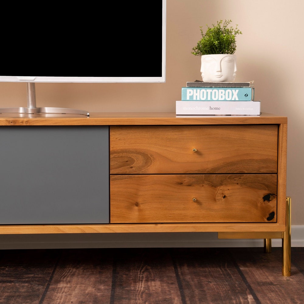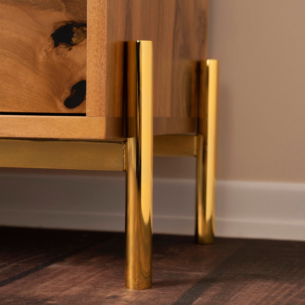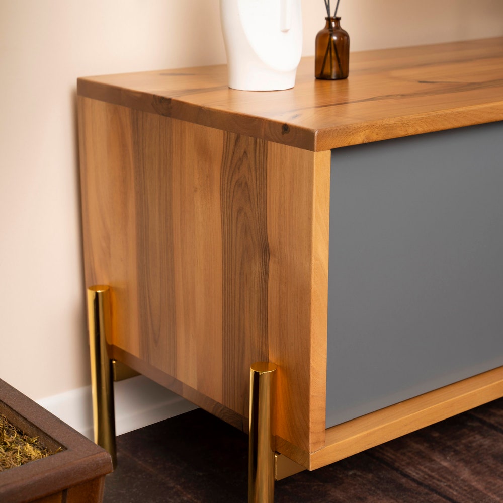 Contemporary Solid Walnut Media Console with Gold Metal Leg, Modern TV Cabinet in Brown & Gray, Stylish Walnut Coffee Table or TV Console