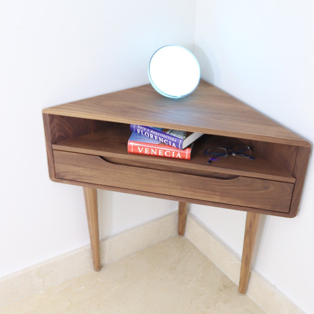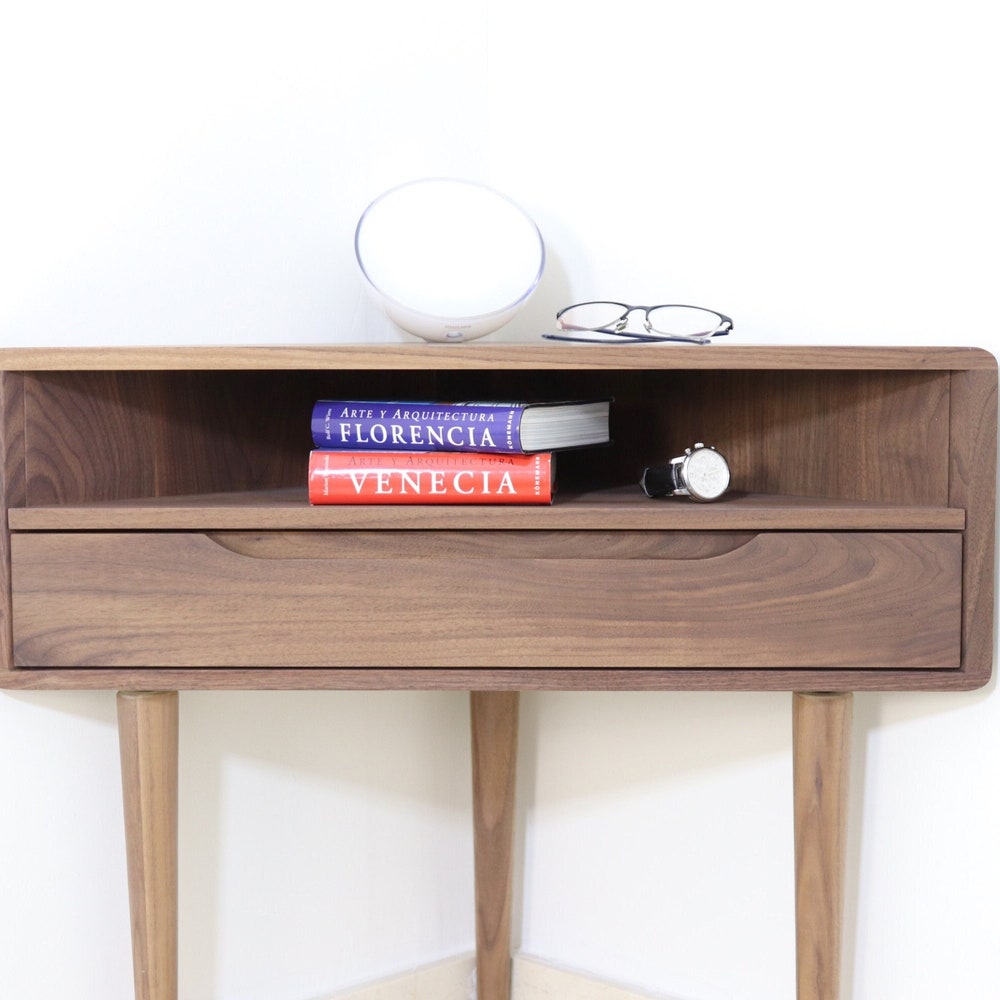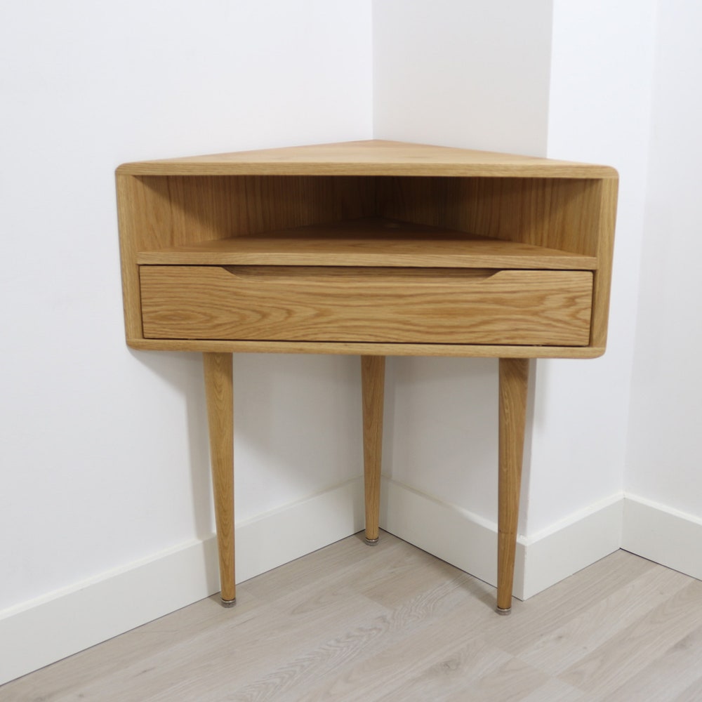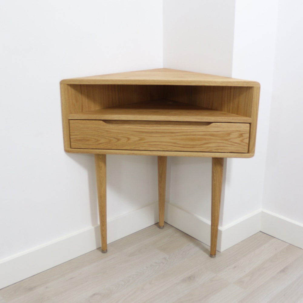 Corner nightstand with shelf and lower drawer in solid Oak or Walnut.