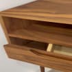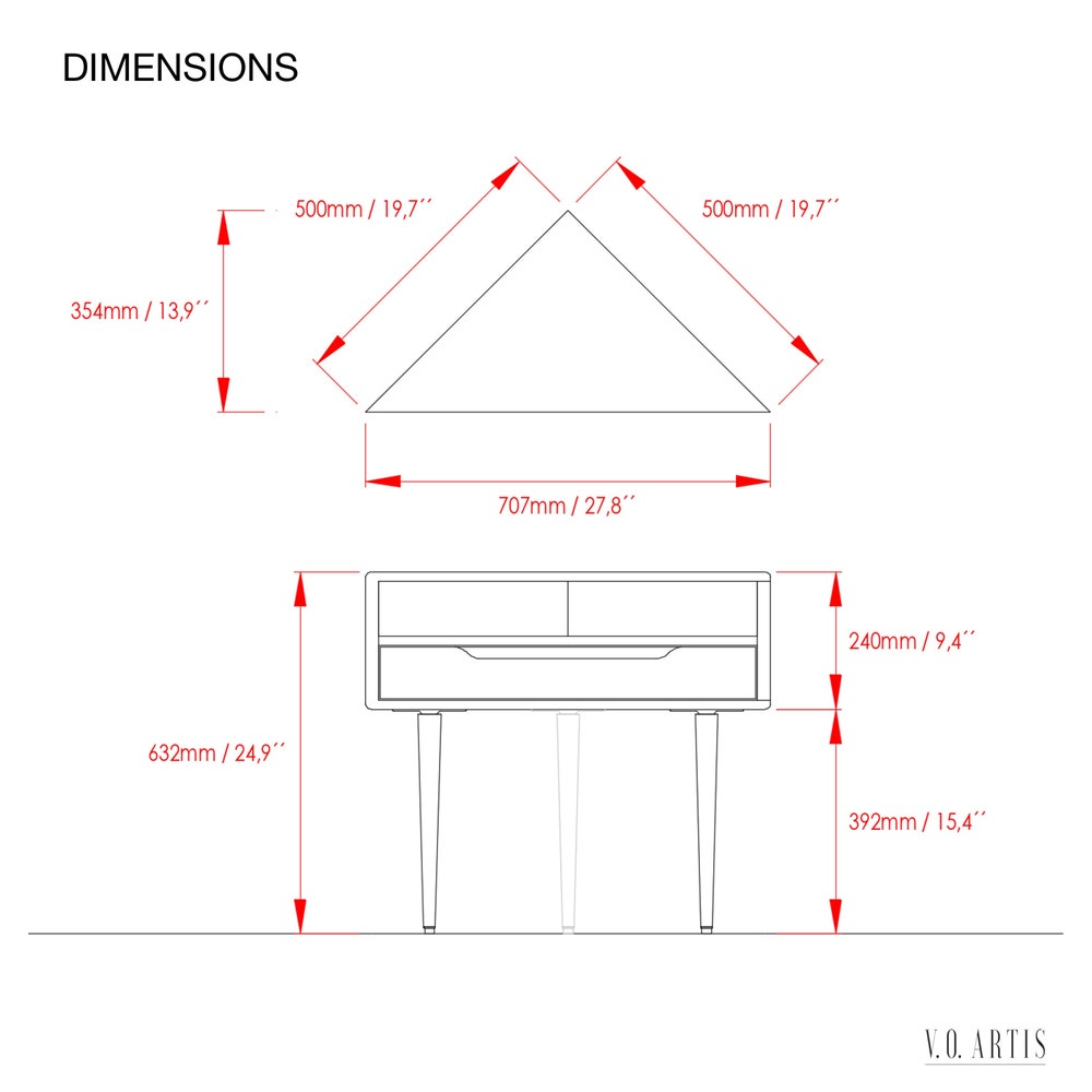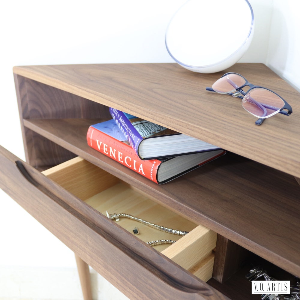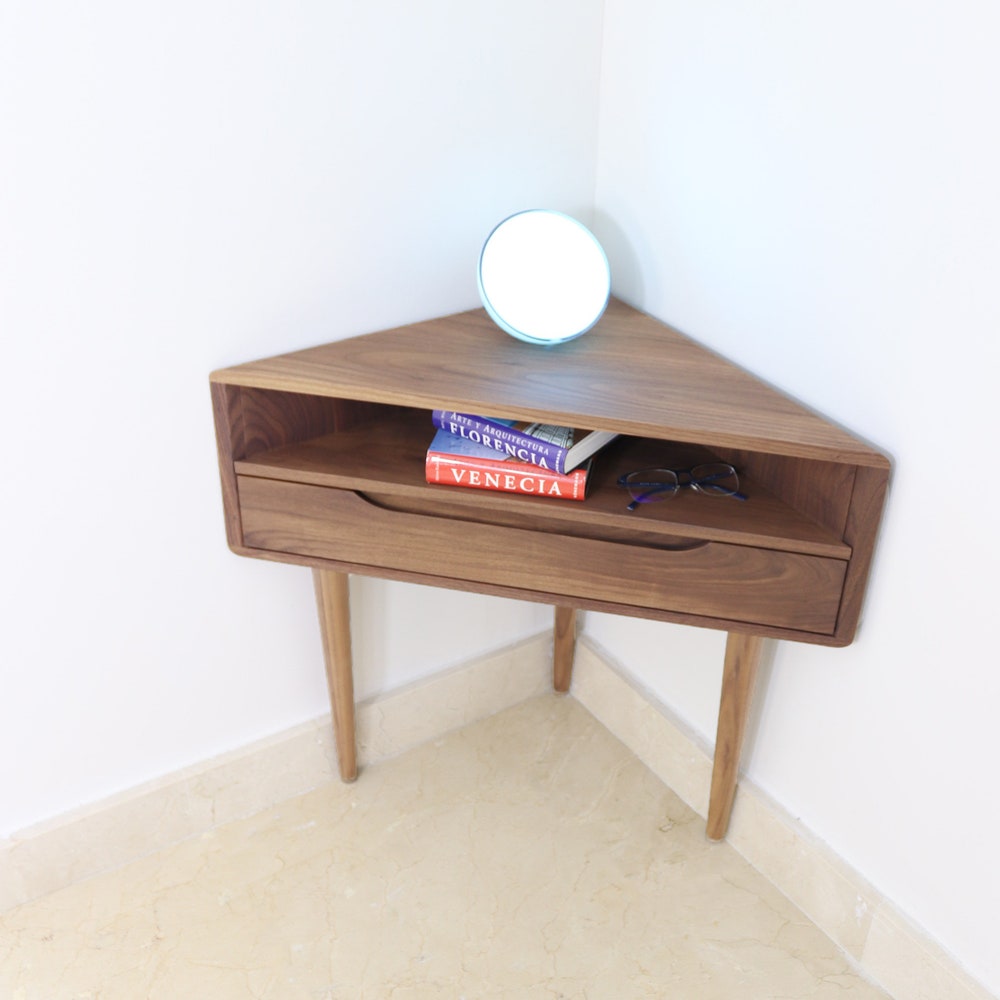 Corner nightstand with shelf and lower drawer in solid Oak or Walnut.