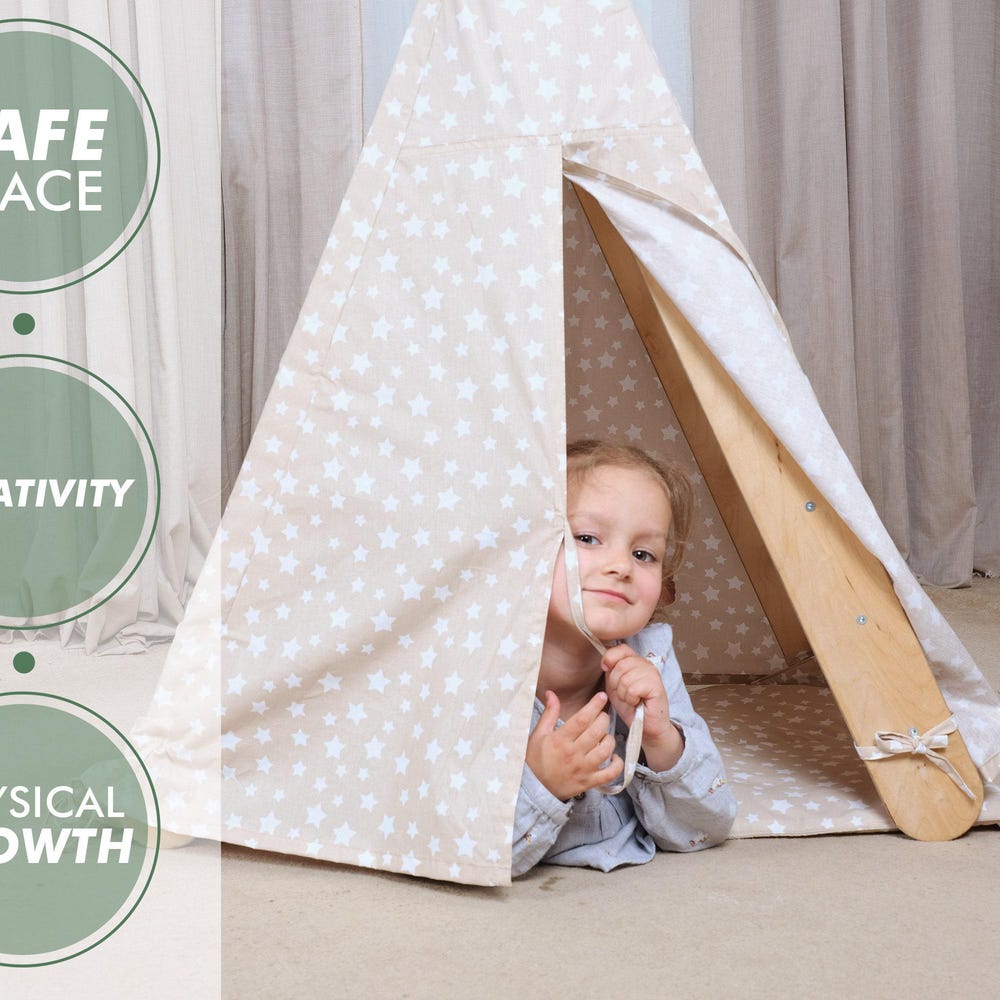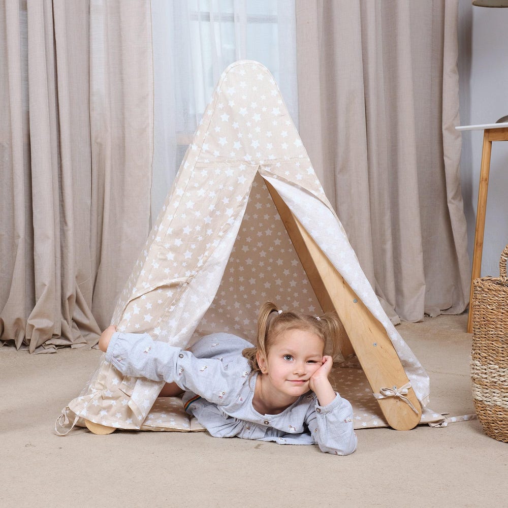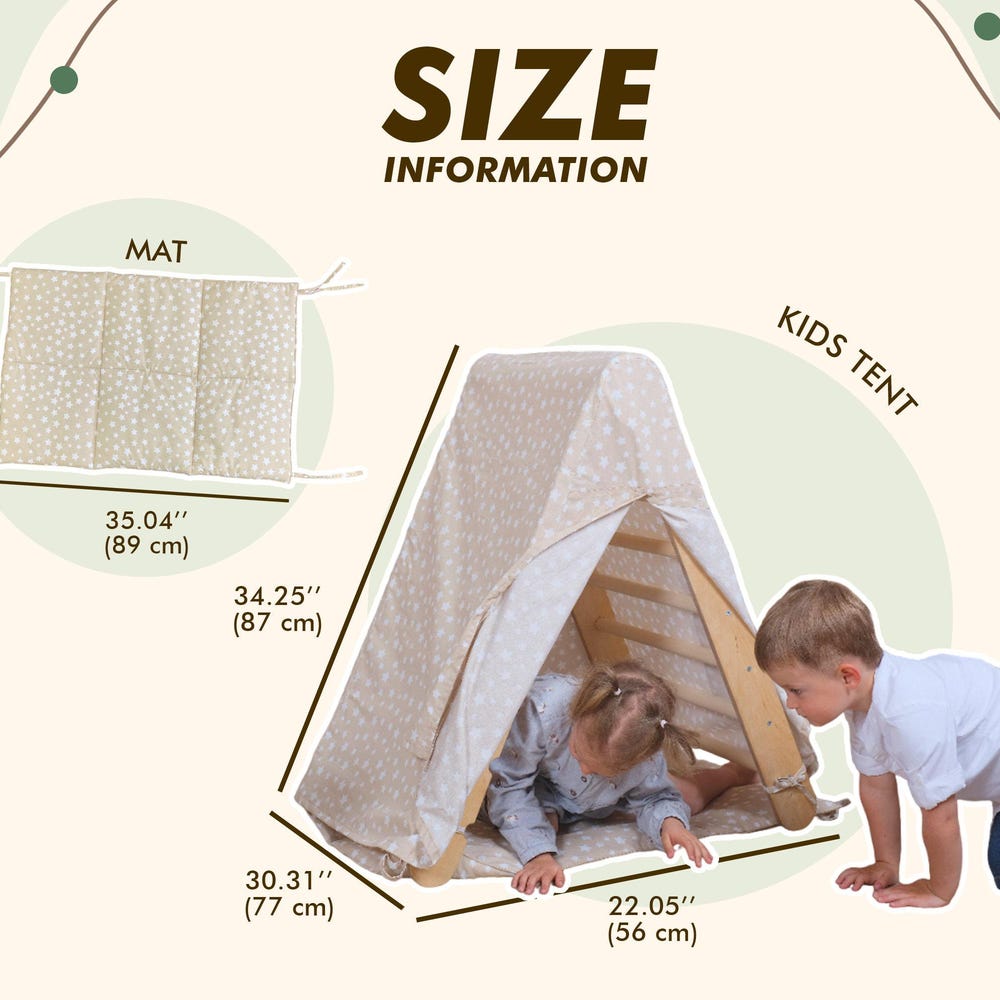 Owing to a special tent cover with mat, your climbing triangle can be easily turned into a cozy teepee. You just need to put on a beige tent, with a delicate white-star pattern, that goes together with a mat. The mat can be placed at a triangle ladder’s base and fixed with special ties for additional comfort. The tent can also be fixed on a triangle ladder with special ties.