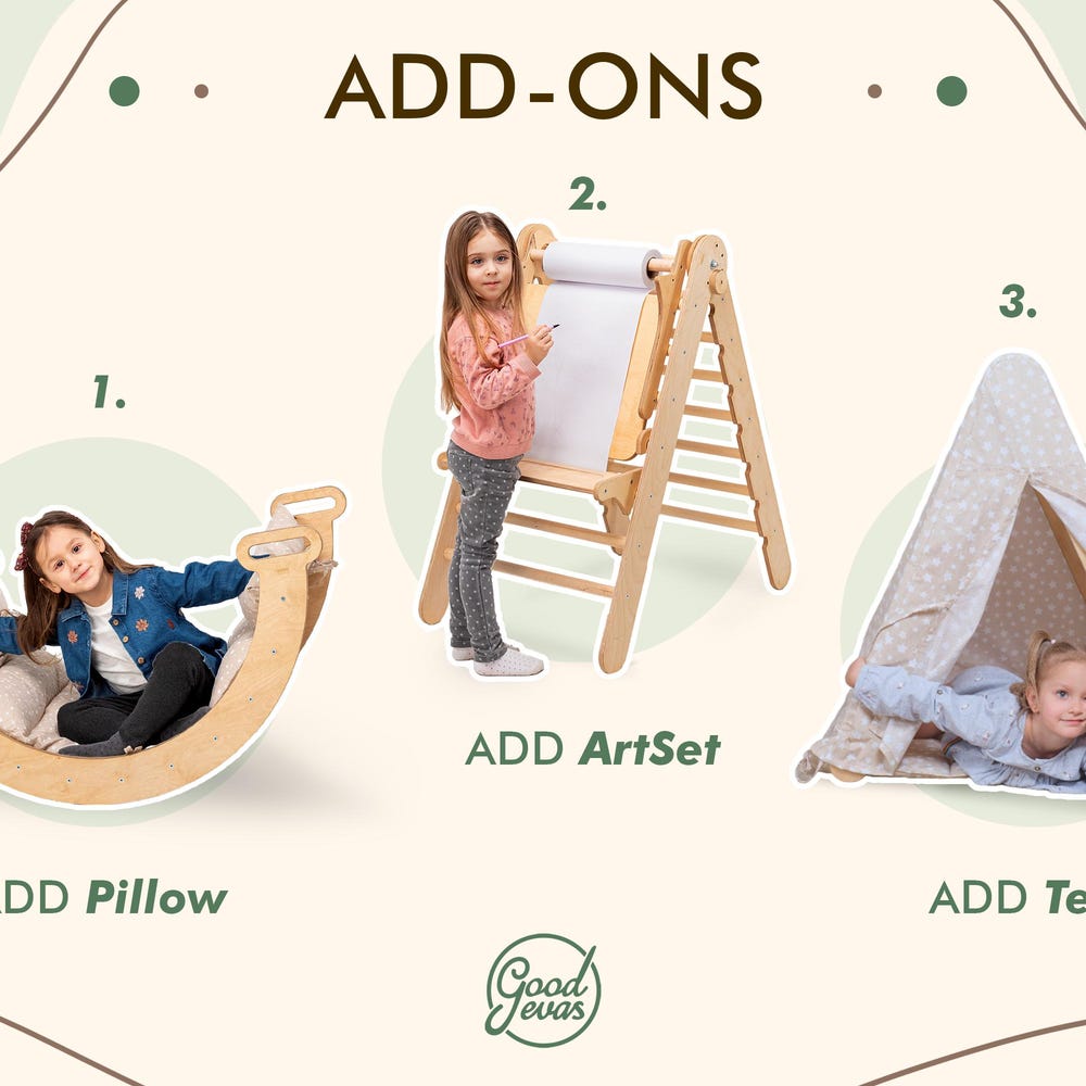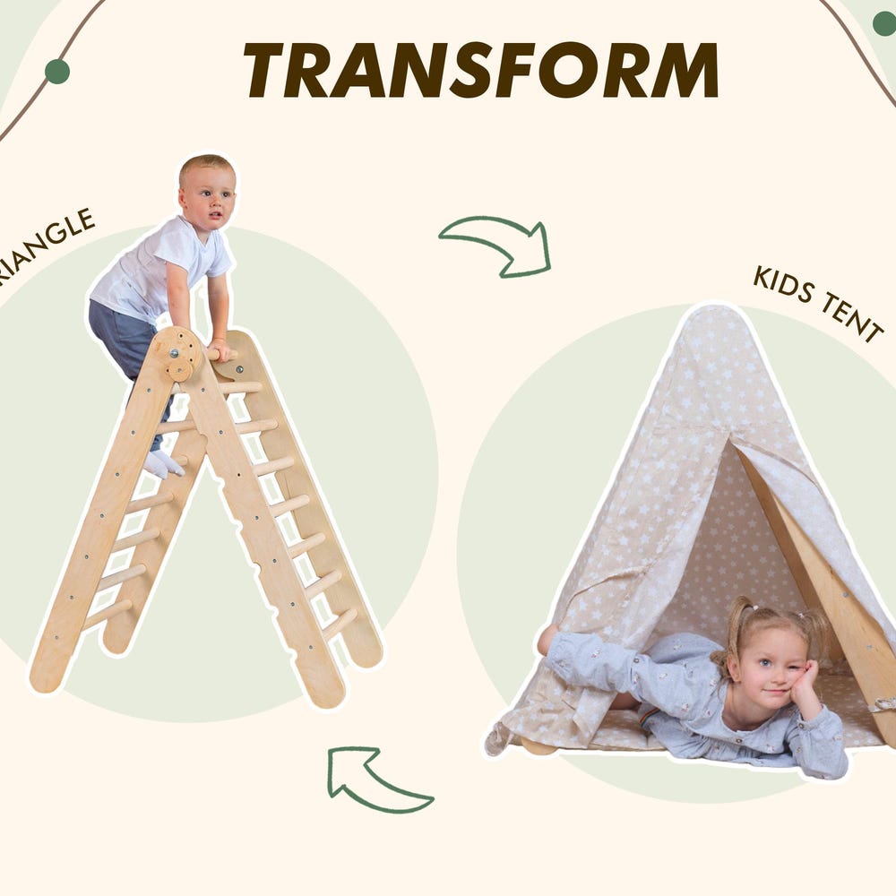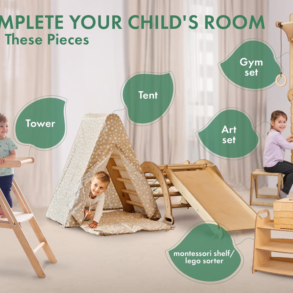 Turn your Montessori triangle ladder into a fairy teepee for kids where your child can play, read books, and develop their imagination. Create comfort and a safe space for rest where your little one will feel protected and calm. In such a play tent, your child can organize their play zone, make up different play scenarios, and develop their creative and physical skills.