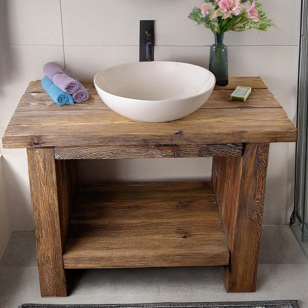 Custom Handmade Rustic Wooden Bathroom Vanity – Farmhouse Style Sink Shelf with Live Edge Reclaimed Handcrafted cabinet table solid wood