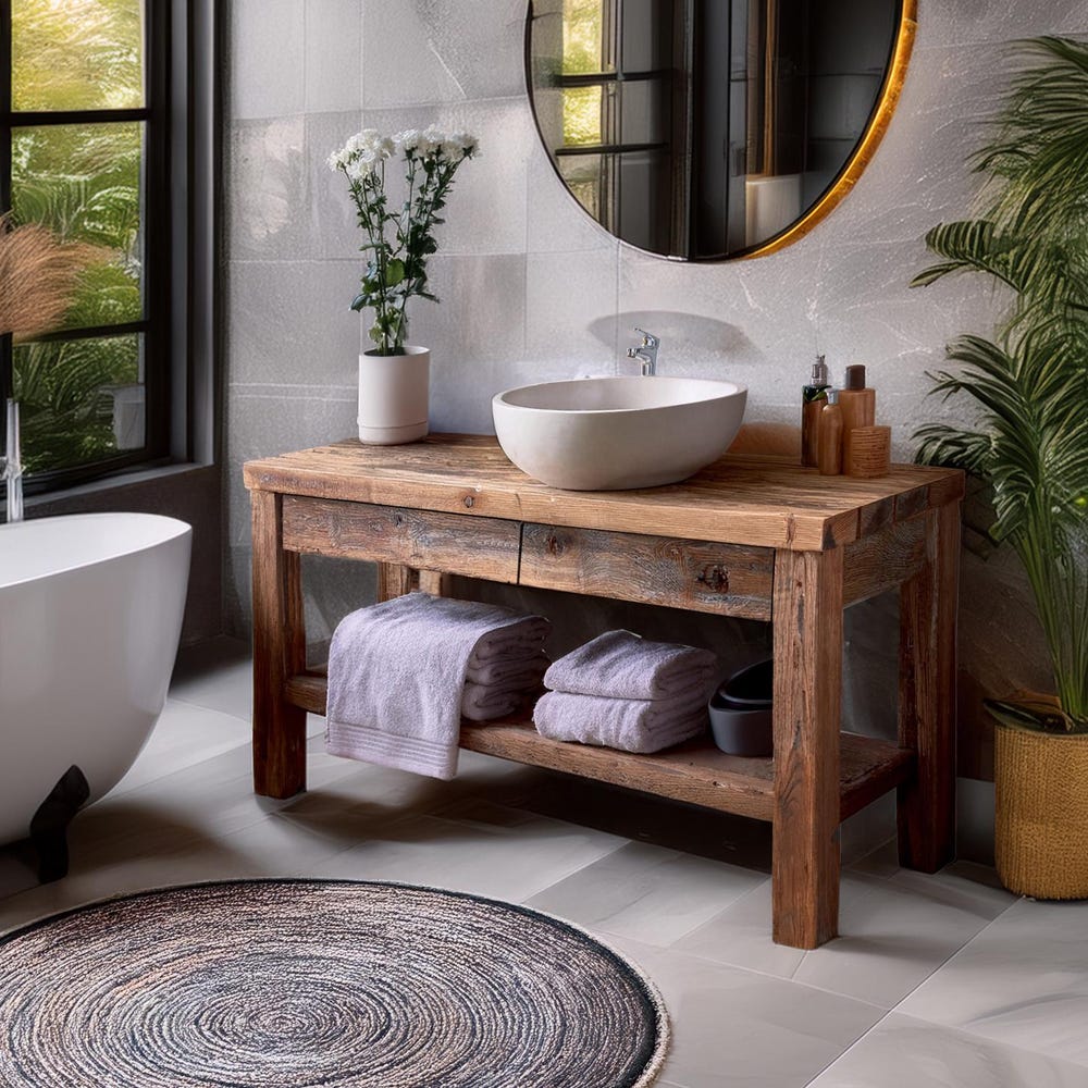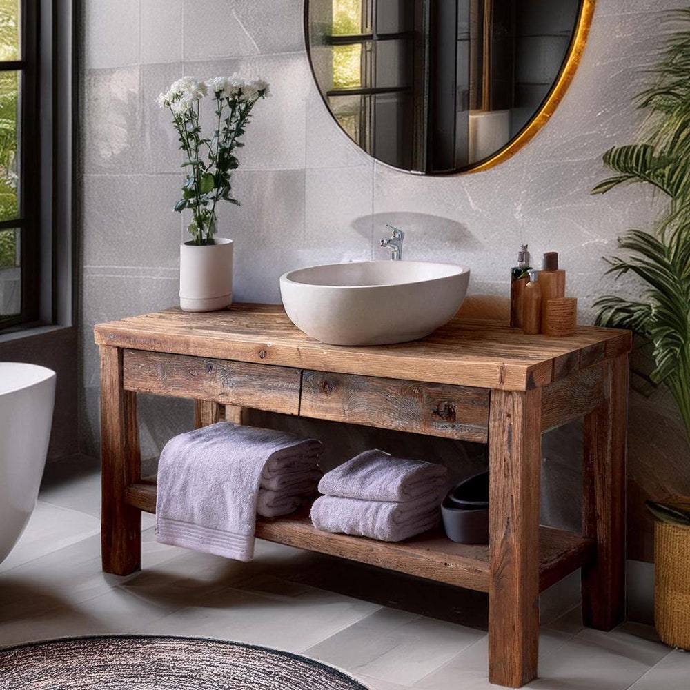 Custom Handmade Rustic Wooden Bathroom Vanity – Farmhouse Style Sink Shelf with Live Edge Reclaimed Handcrafted cabinet Wood Country Style
