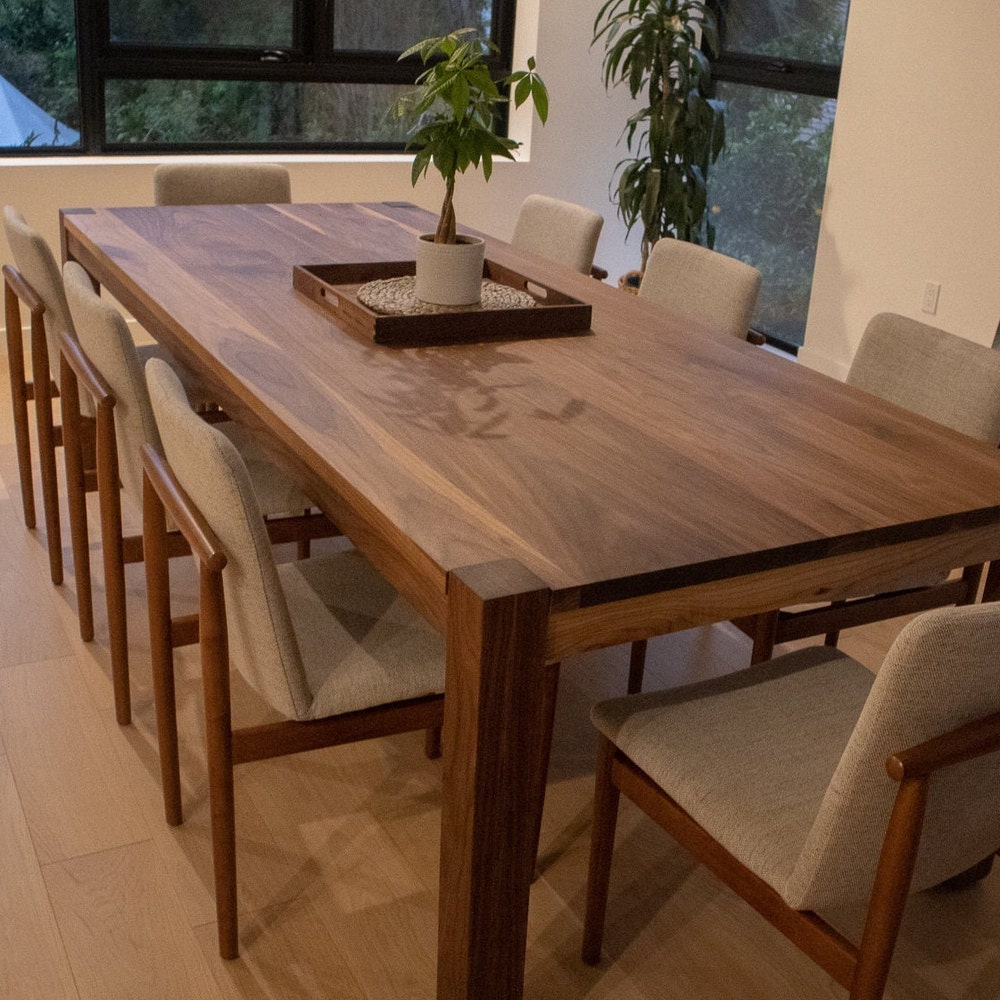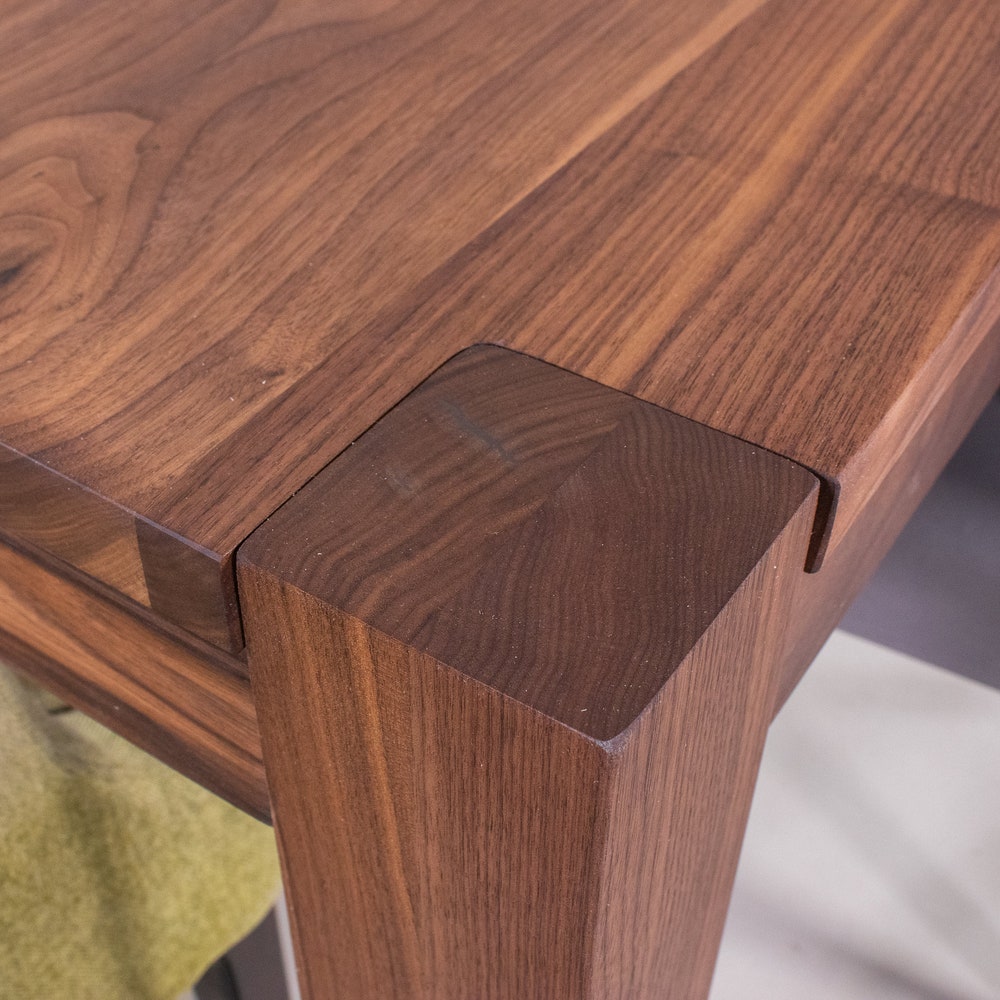 This walnut table with the corner post legs coming through the tabletop has a youthful energy. It’s a twist on a classic parsons table. We build every table to order so there are many ways to make this table perfect for you.