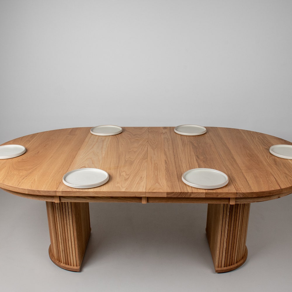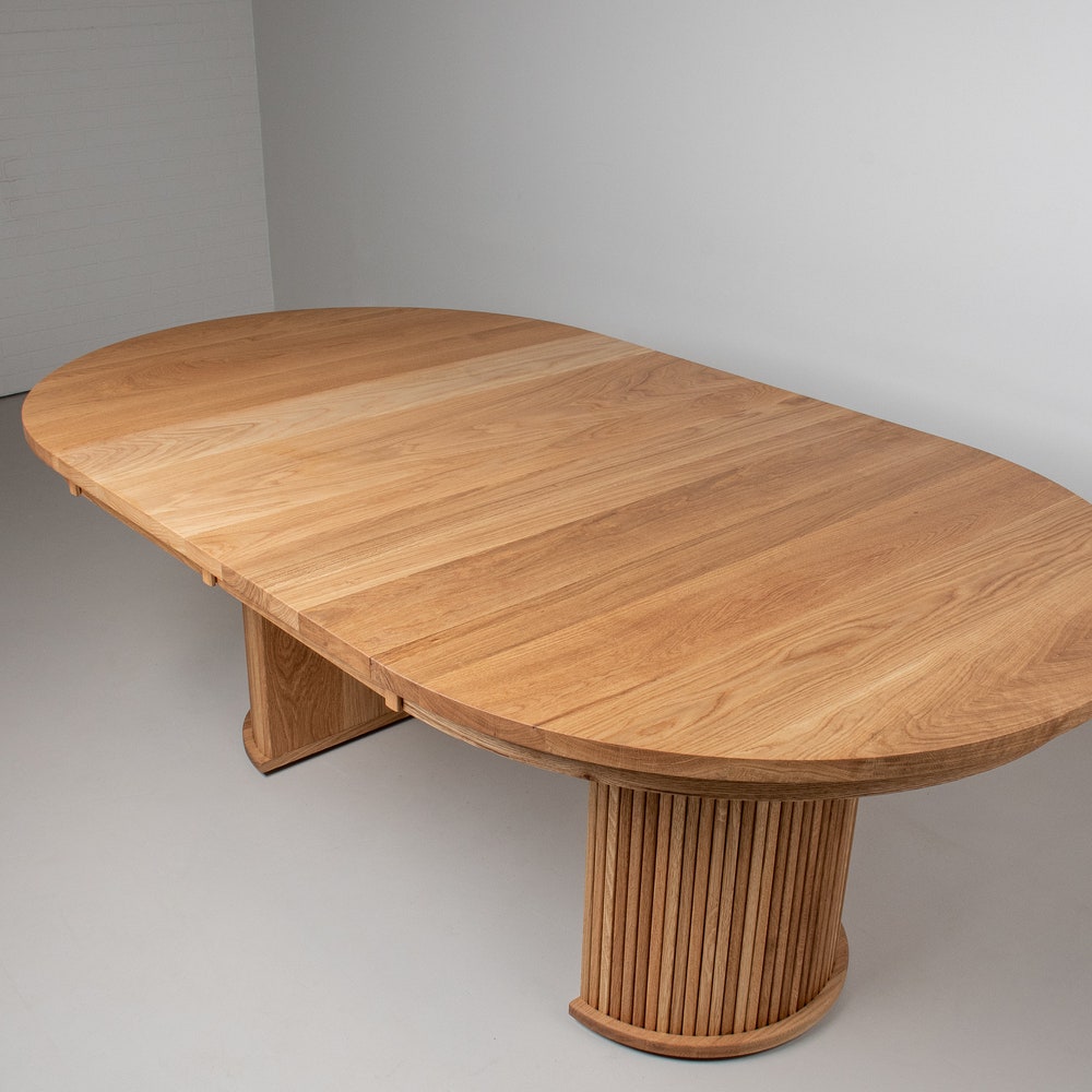 This custom oak dining table features a round pedestal base that pulls apart. An extension table like this allows you to always be ready for a few extra people around the table. The core table looks great for everyday use – and the leaves are easily added to the middle to accommodate a few more people. We build every table to order so there are many ways to make this table perfect for you.