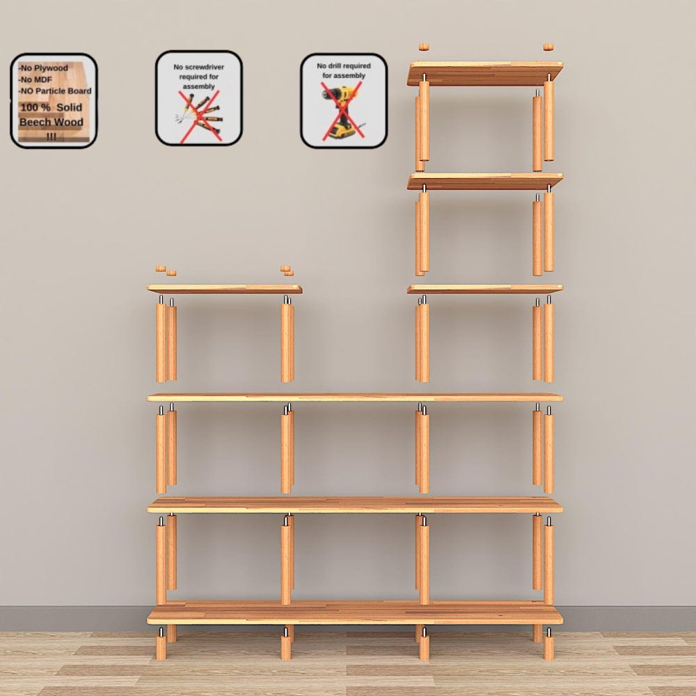 These unique wooden shelves are a perfect furniture piece that combines both functionality and elegance. Crafted from high-quality wood, this shelving system offers quantity and style in one. It provides an ideal space for storage in your bathroom and kitchen, as well as an area in your living room to showcase your books or organize your other decorative items. With its design featuring different shelf dimensions, it ensures easy access to your books while adding a modern touch to your room. The rounded corners and finely crafted details offer a perfect experience in terms of both aesthetics and safety. Serving as an elegant addition, it also provides ample storage space.