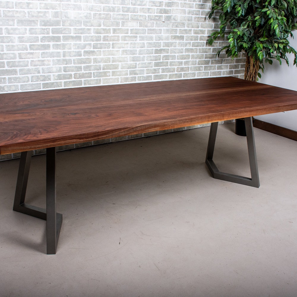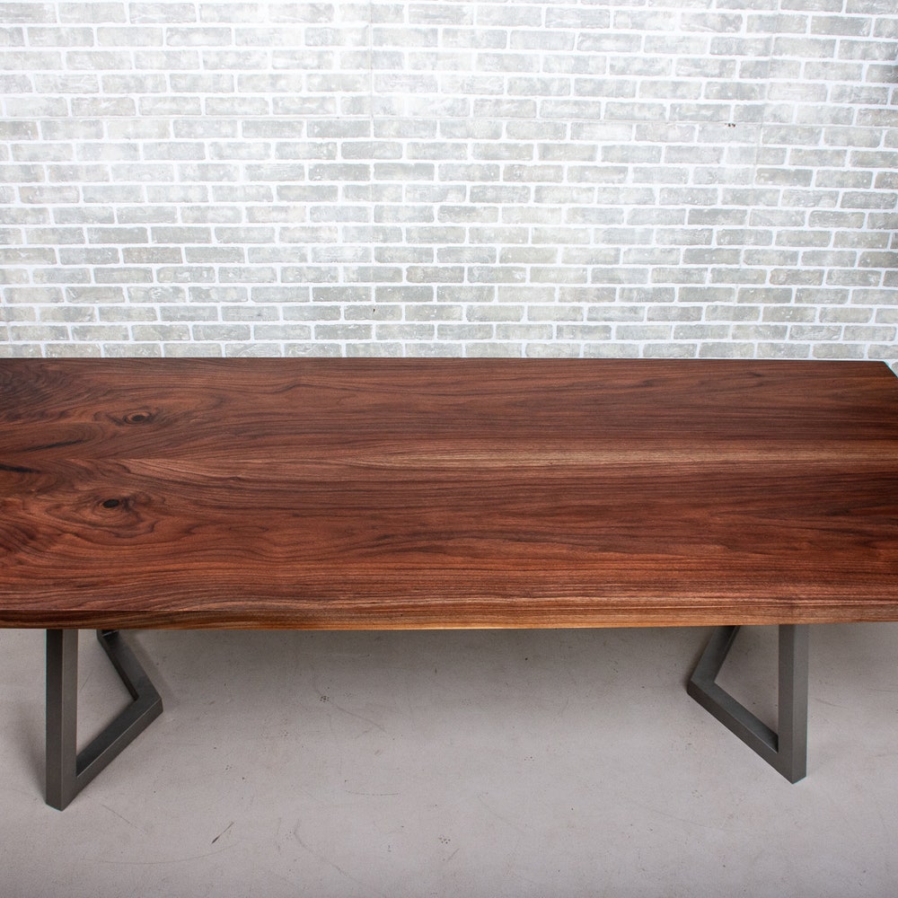 This custom table top is made with 2 slabs of live edge walnut. The two slabs are bookmatched which means that they were beside each other in the tree, resulting in a symmetrical, balanced look. The table we photographed was 36” x 84” which seats 6-8 people comfortably. Because we build each table to order, we can build your table in exactly the size you need.