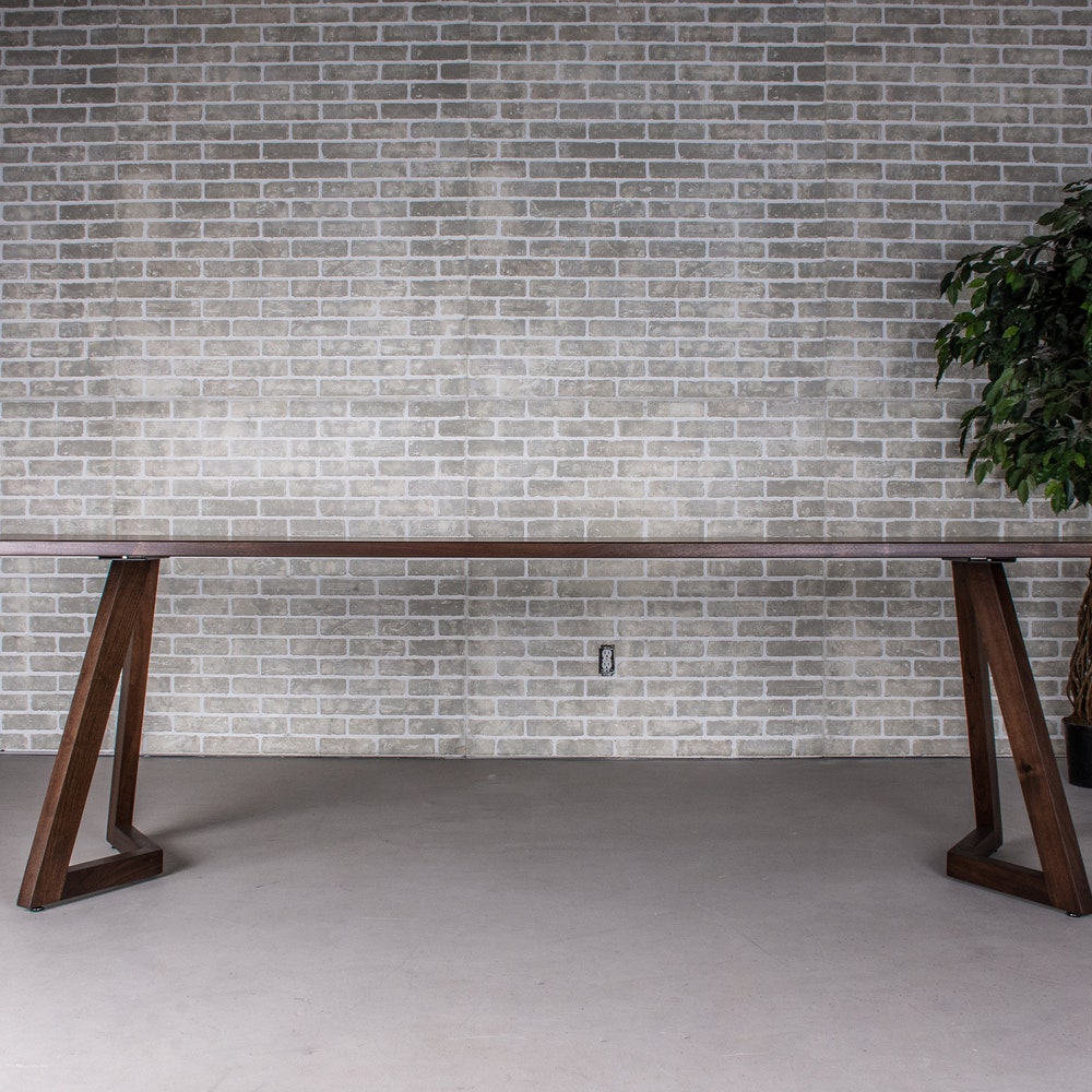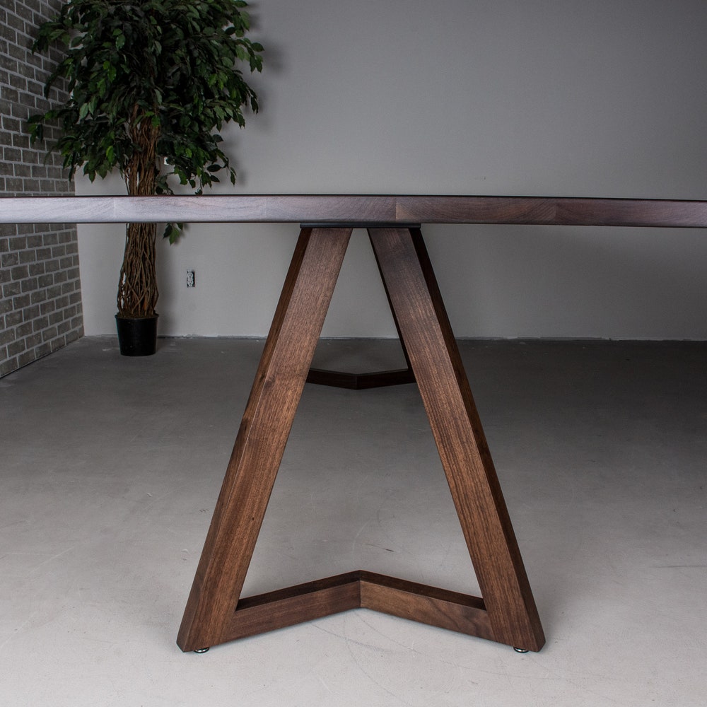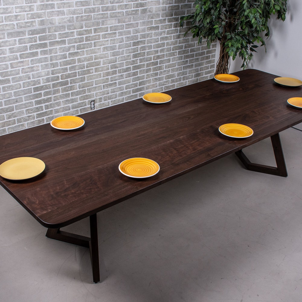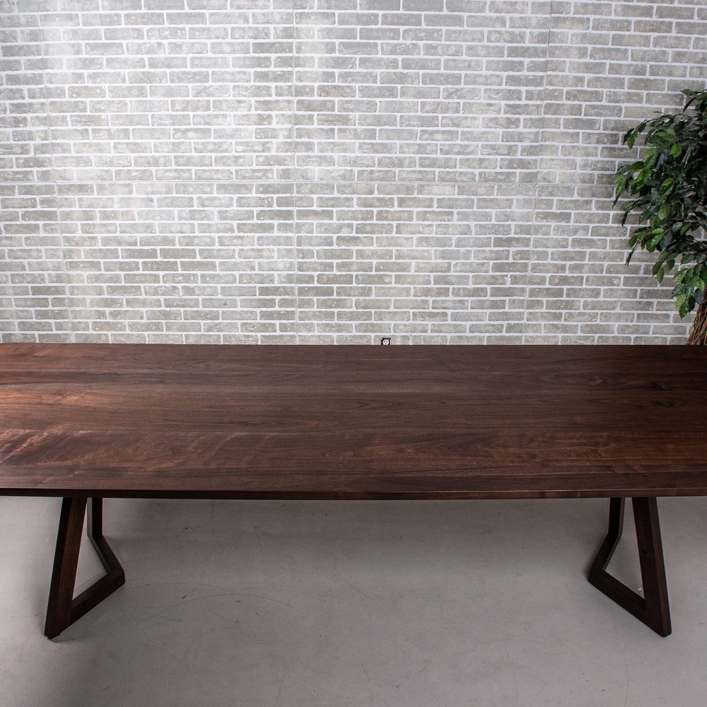 This custom walnut dining table has an extra layer of finish on it. We finished the walnut first with black oil to bring out the darker tones in the wood. And then we used Osmo finish for added durability. We build every table to order so there are many ways to make this table perfect for you.