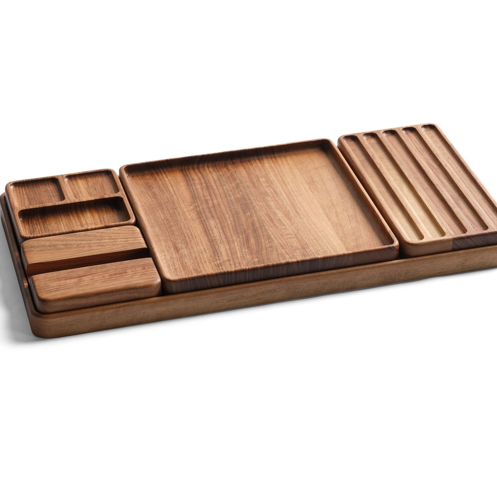 The foundation of the Gustav set, the Main Tray is designed to store and display a variety of accessories. Spacious and versatile, it can accommodate everything from larger items like headphones, glasses, or chargers to personal items like makeup products or daily essentials. The smooth wood surface provides a refined space to keep your items organized, while the raised edges ensure everything stays in place. This tray becomes the perfect base, bringing order and sophistication to any desk or countertop.