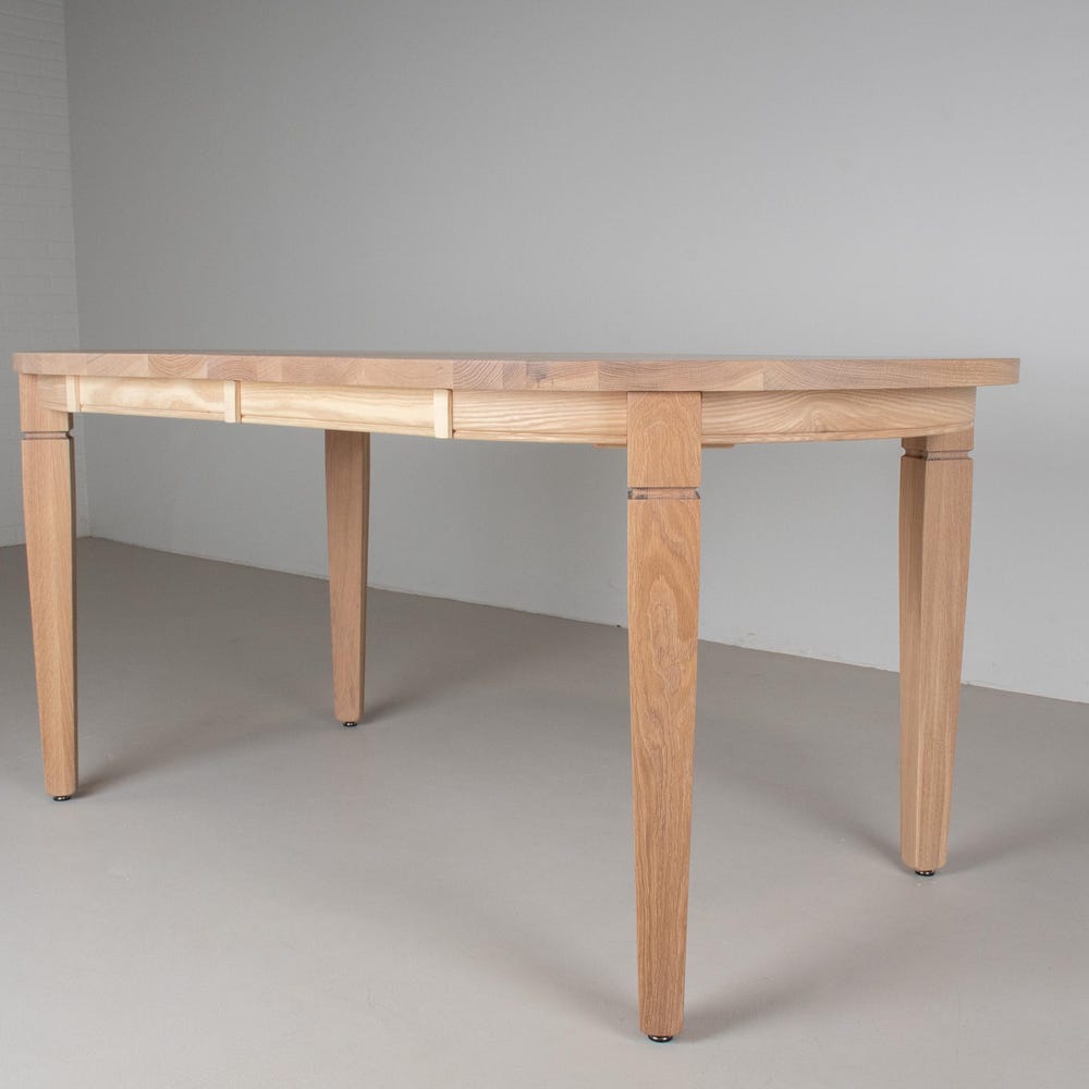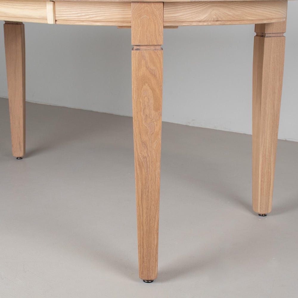 This custom wood dining table is inspired by other tables you can see in our shop and was customized in a variety of ways. To achieve a light color on the oak that doesn’t lean into yellows, our customer chose a clear finish instead of the natural and added detailing to the legs. Using this base and leg style on an oval table was also a customization. The end result is a lovely modern oval table that will be easy to use and sit lightly in a kitchen or dining room. We build every table to order so there are many ways to make this table perfect for you.